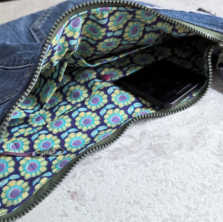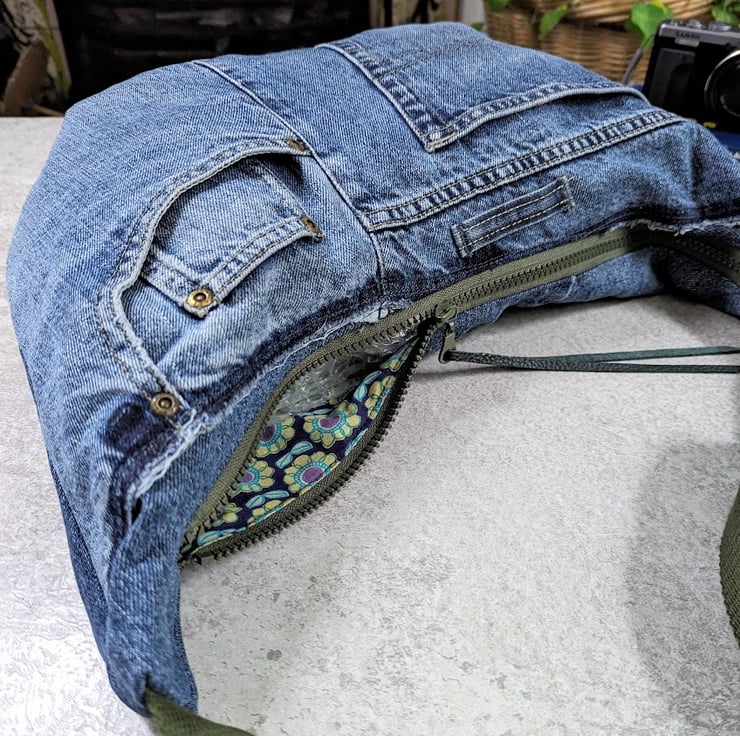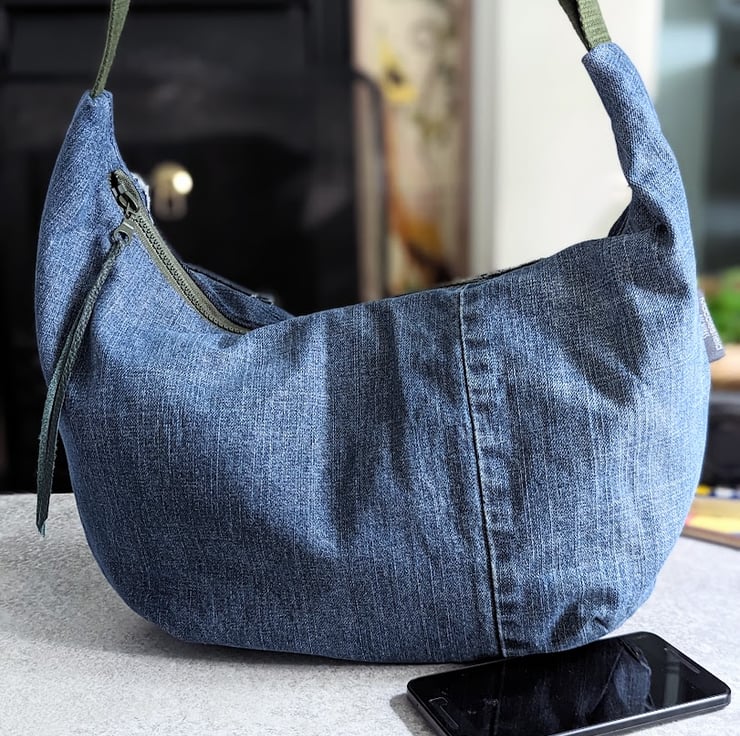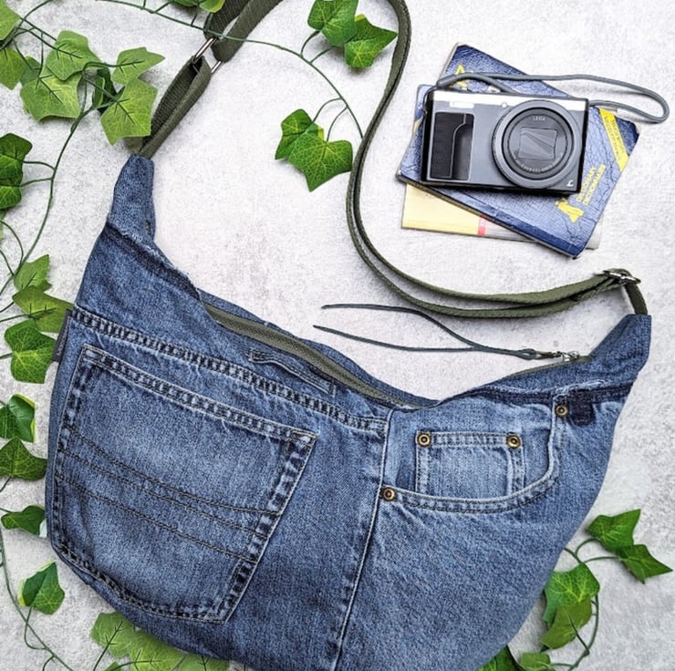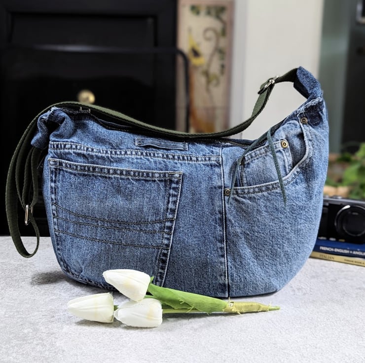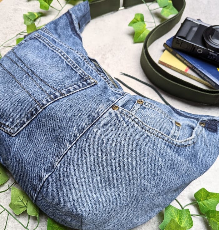 Made by upcycling denim jeans, this cross body sling or dumpling bag is light and casual to wear with a contemporary vibe.