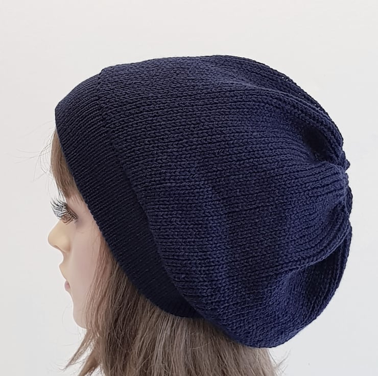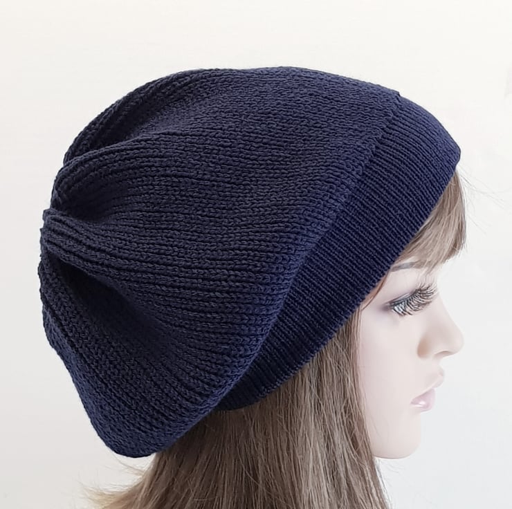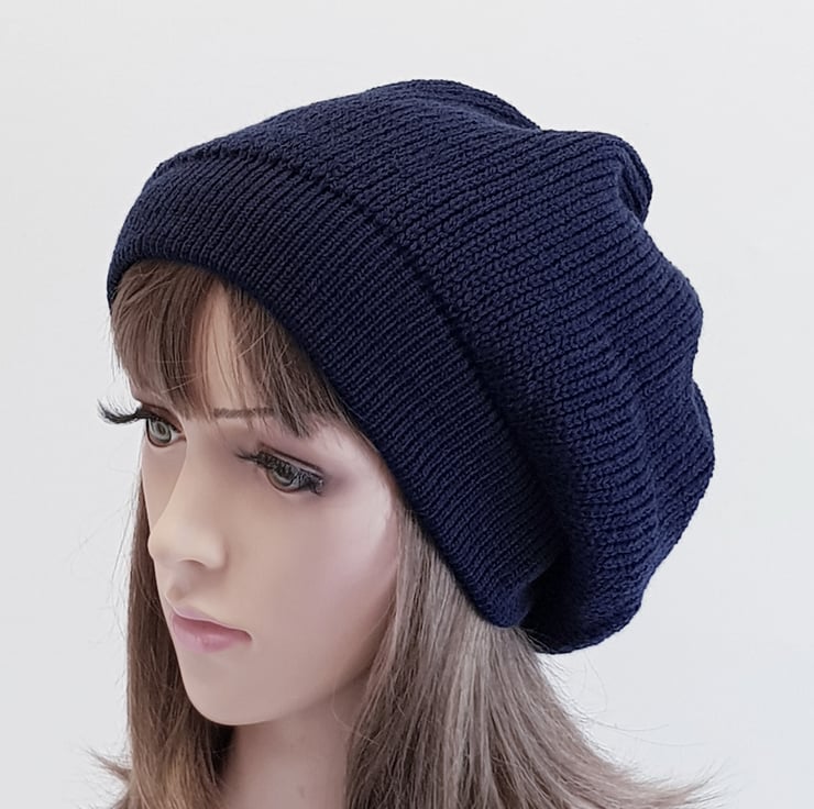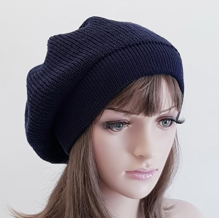 Navy blue baggy beret for women, handmade knitted slouchy beanie hat.