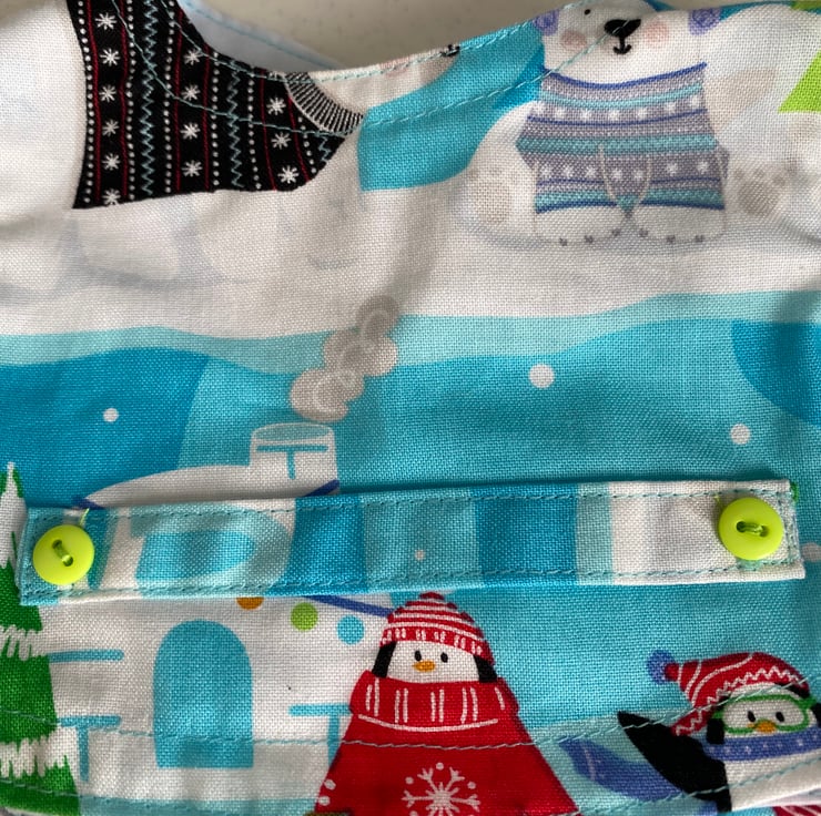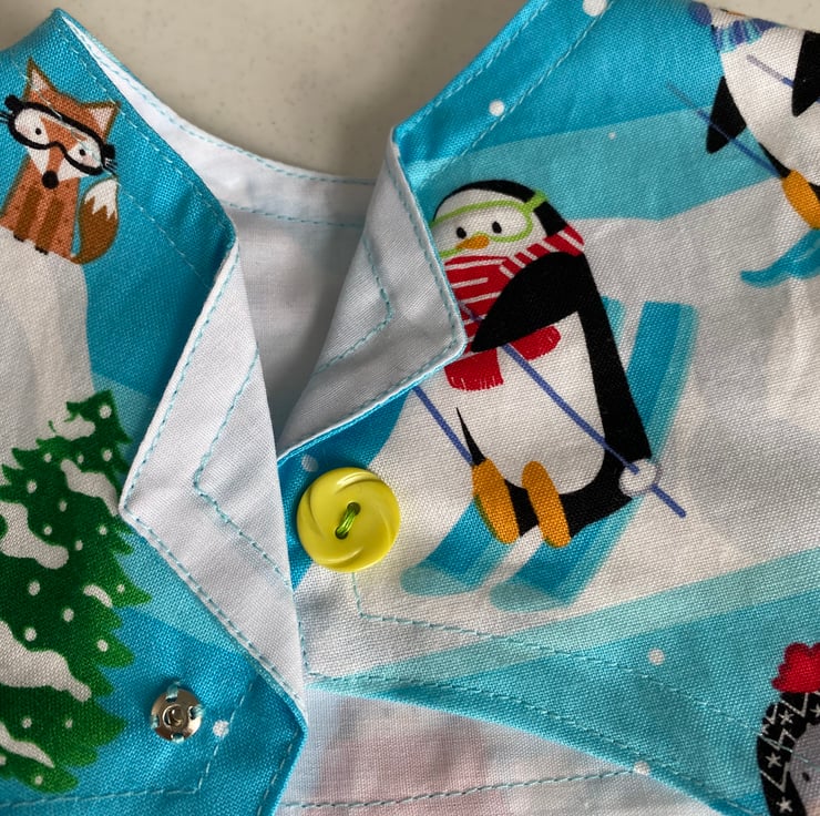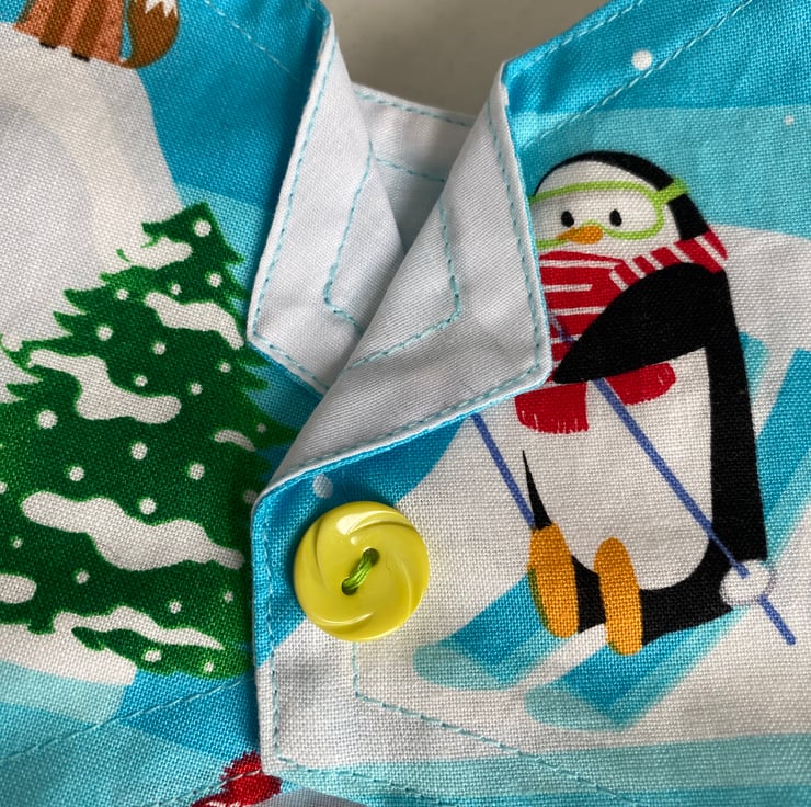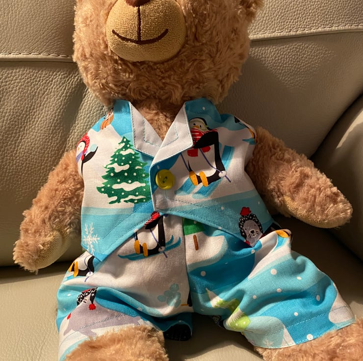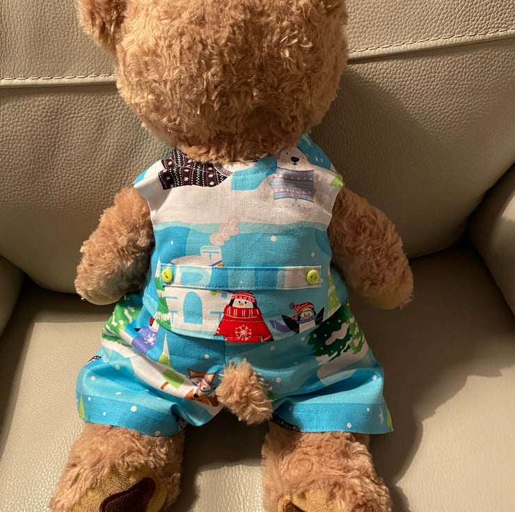 Large size teddy bear outfit lined waistcoat and shorts/trousers. White and turquoise with a winter/ Christmas scene. The shorts have a special little slit at the back to accommodate your toys tail! The waistcoat has a belt at the back just like a real waistcoat!