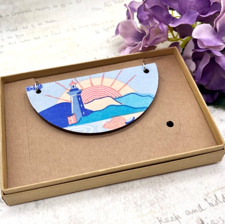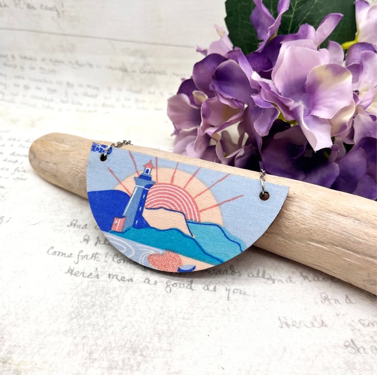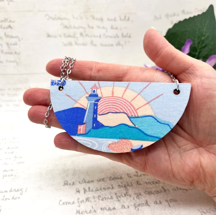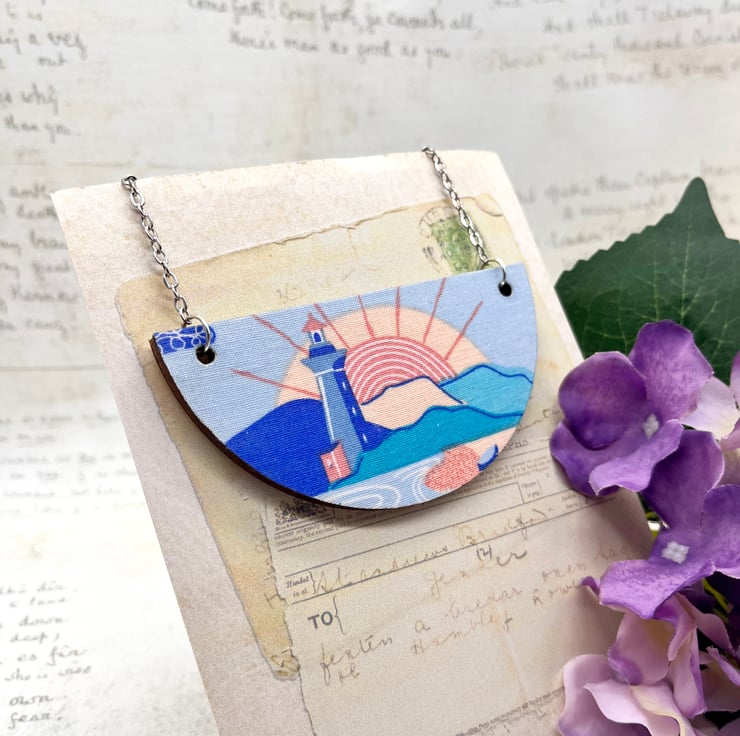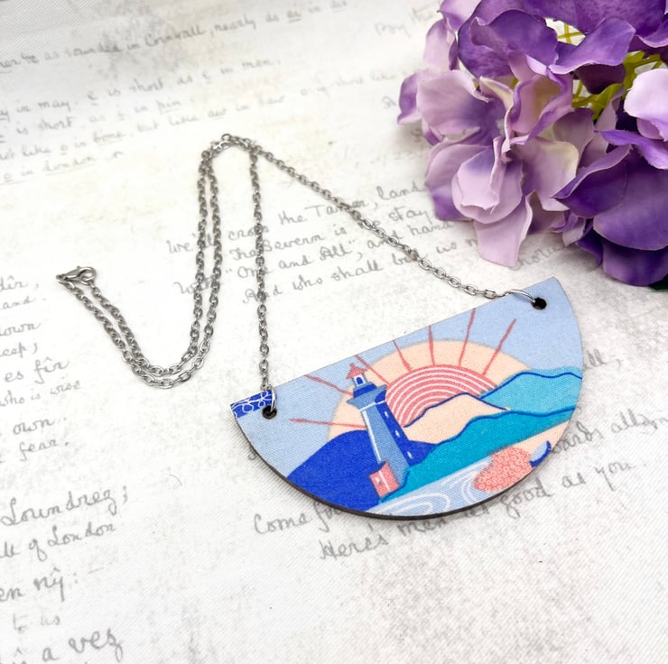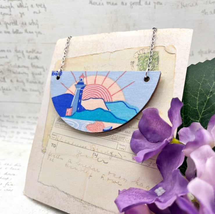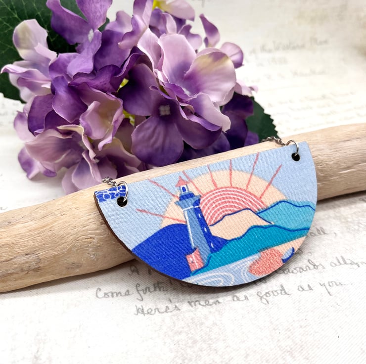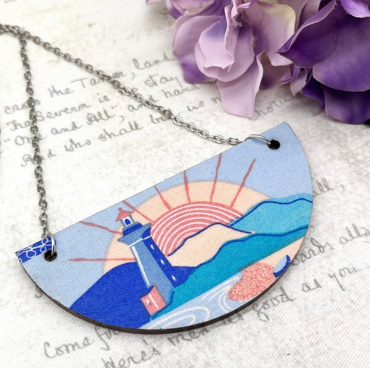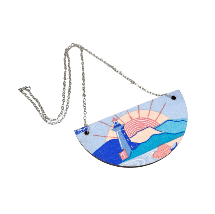 For this stunning statement necklace, I’ve chosen this blue lighthouse as the focal piece, slightly off-centre, with rolling hills and the sunset behind in orange hues, reminiscent of designs from mid-20th century.