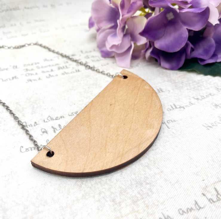 I’ve then secured this section of fabric semi-circular FSC approved plywood shape, using specialist fabric coating medium and varnish. I've left the back of the necklace showing the natural colour and grain of the wood, but simply adding a layer of varnish.