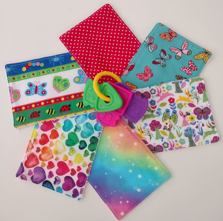 6 x Pretty cotton poplin and white towelling wipes, for baby burps, mum after feeding, nappy changing, toddlers sticky fingers and noses, grazed knees, at the playground, out shopping, picnicking and a myriad of other uses.
