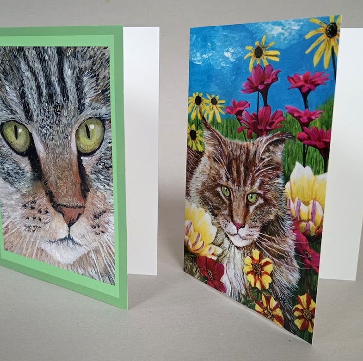 A lovely bright colourful pack of cat greetings cards. These are printed from paintings I have done of my own cats.