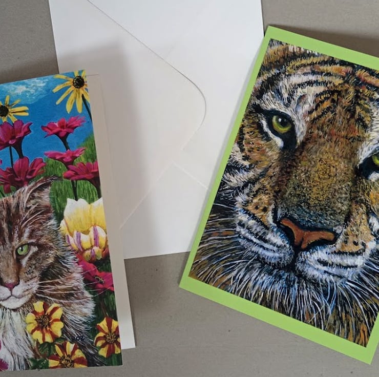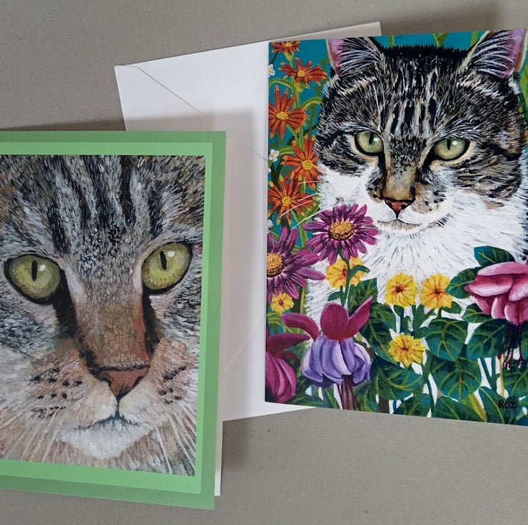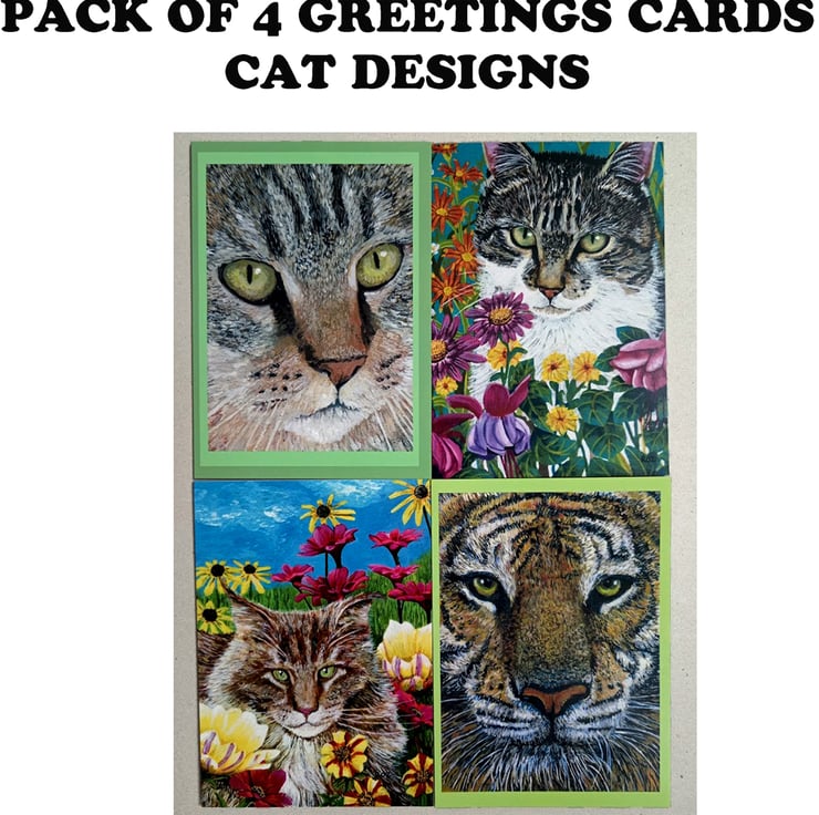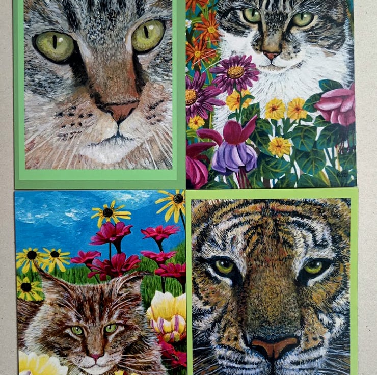 Cat Greetings cards. My own Art. My own cats ( except the Tiger!) . 5 x 7 ins. There are 4 in each pack, one of each design. Supplied with envelopes. Blank inside for your own message.