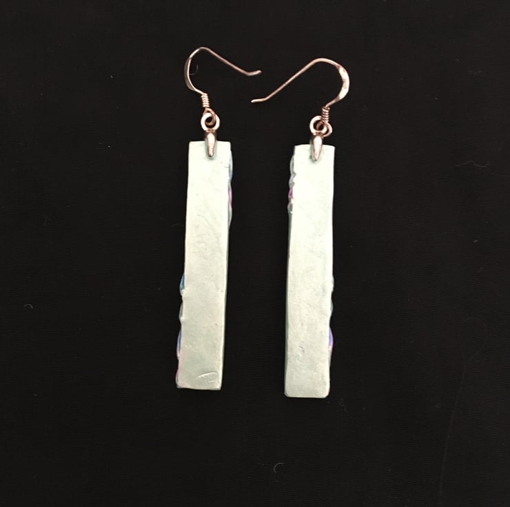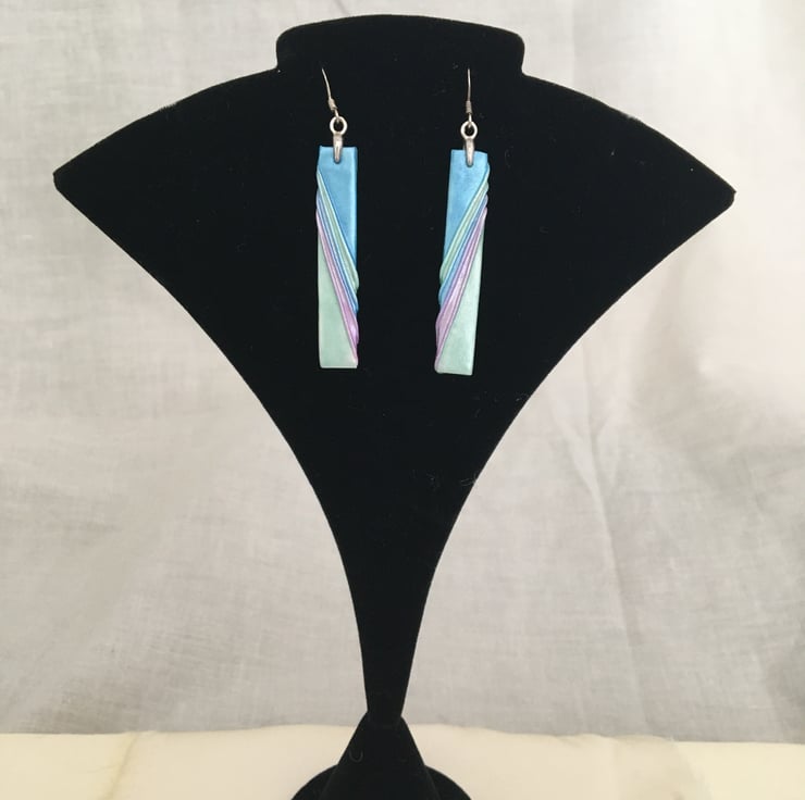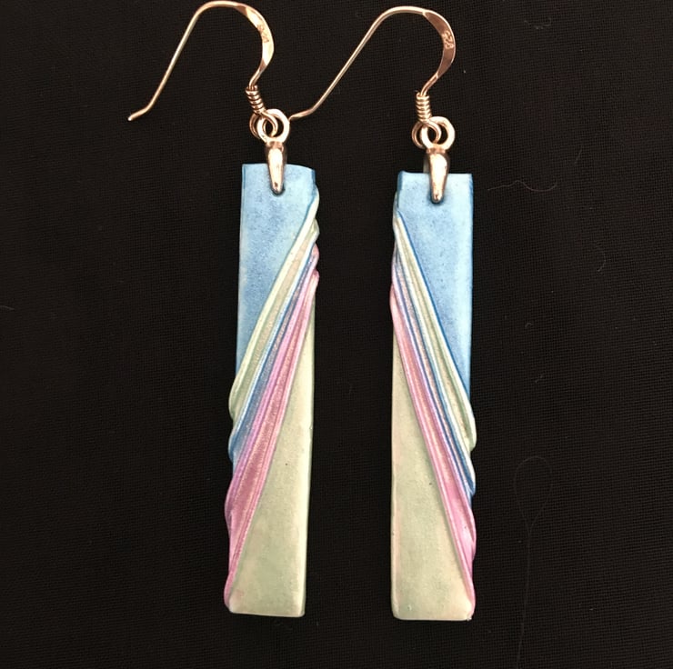 These unique handmade earrings are created using a polymer clay base. The basic back shape is created and then the outline of the design is formed by finely hand-rolling the clay and placing in position. Specialist powders are then added to enhance the delicate colour tones into a soft satin sheen before firing.