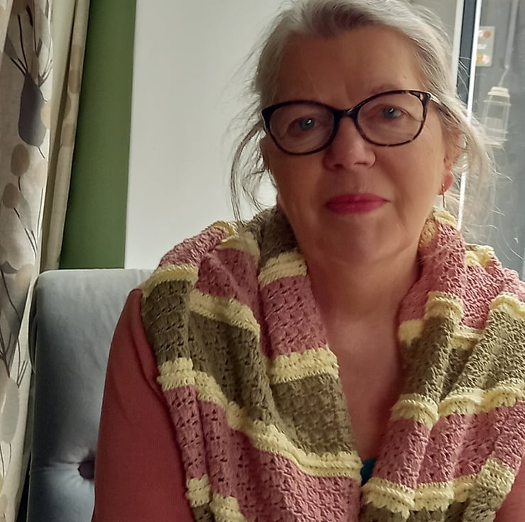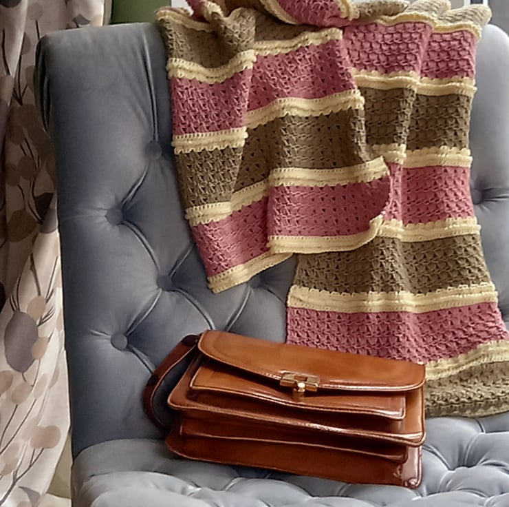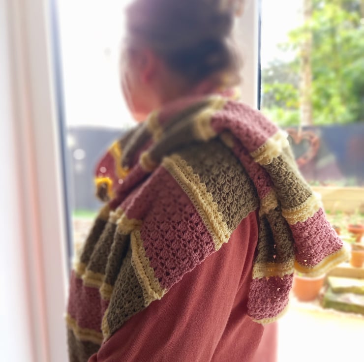 Crochet pattern for you to download and print off at home. Lovely to make striped, scandi, style crochet shawl/wrap. I used a silky cotton yarn in double knit with a 3.5mm crochet hook. The pattern is worked in rows of three colours, in shell stitch and optional crab stitch.