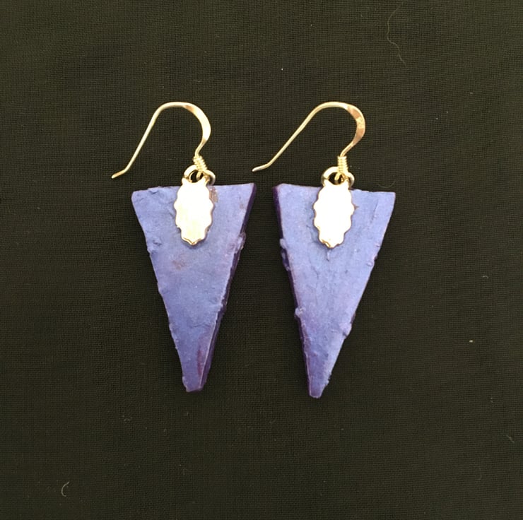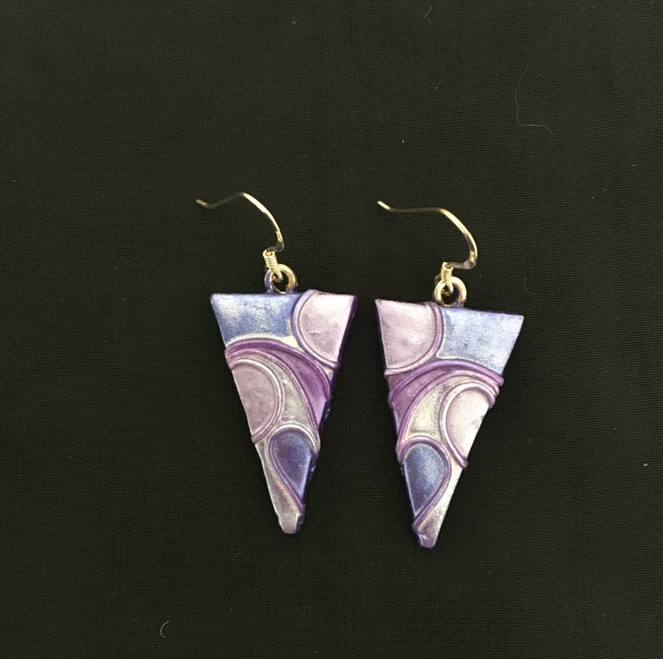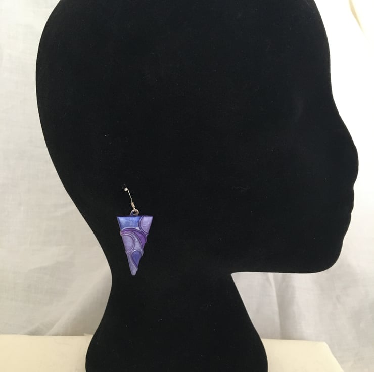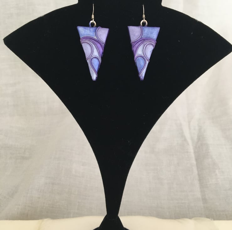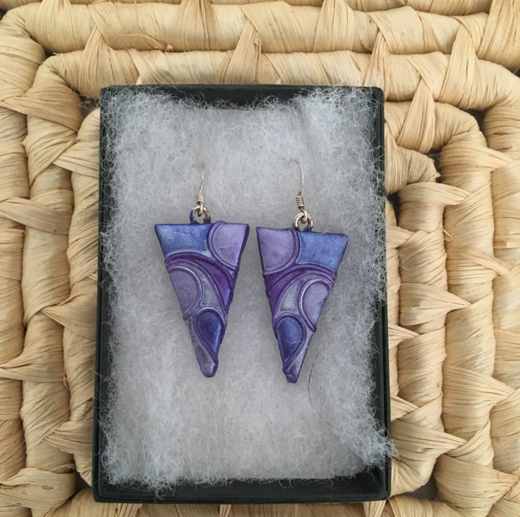 These unique handmade earrings are created using a polymer clay base. The basic back shape is created and then the outline of the design is formed by finely hand-rolling the clay and placing in position. Specialist powders are then added to enhance the vibrant purple colour tones before firing.