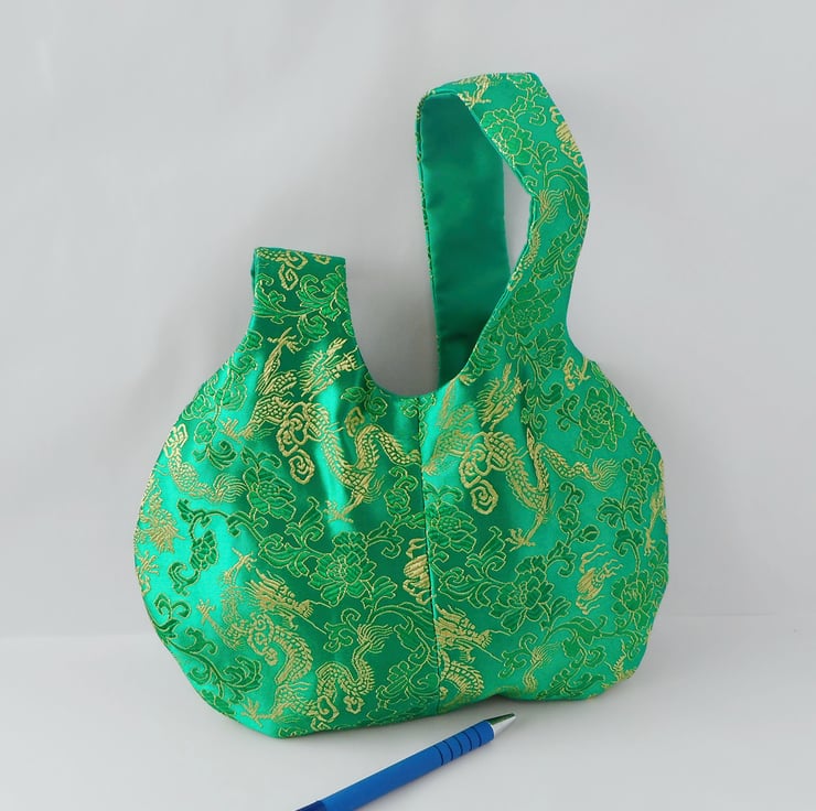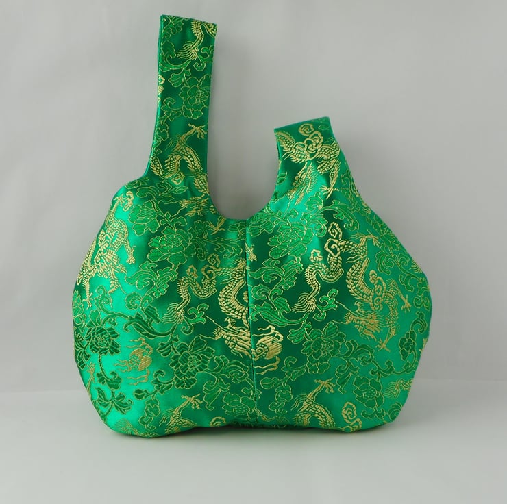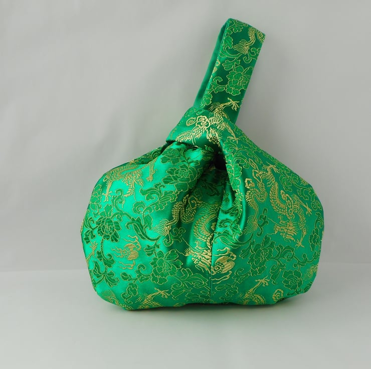 This japanese knot bag is made from a gorgeous emerald green satin brocade with a golden dragon jacquard design. This is my very last piece of this fabric, so unless I stumble across another few metres, this is the last of these bags.