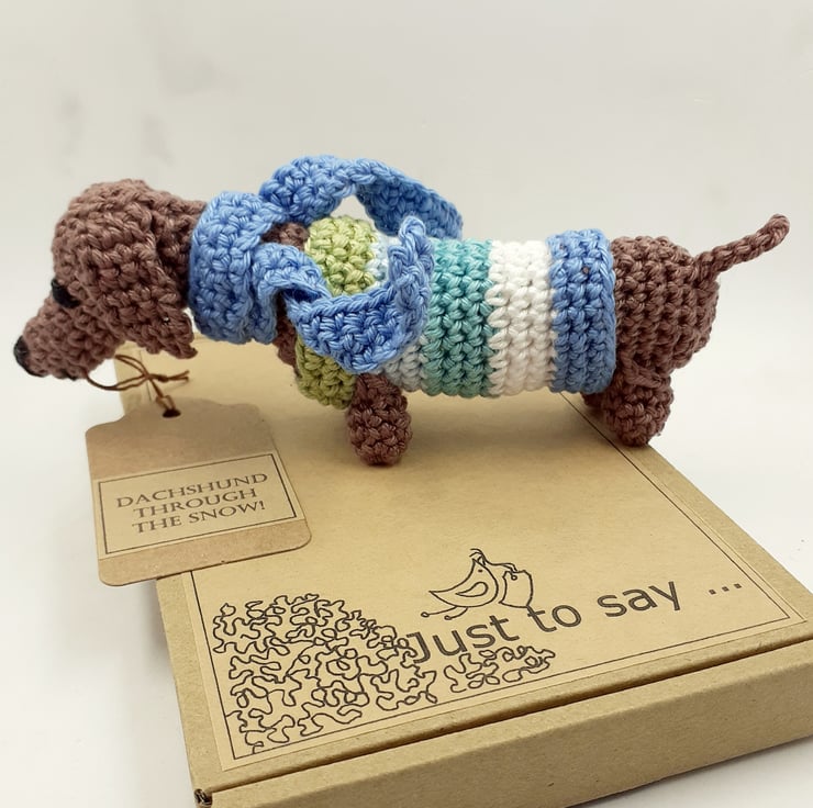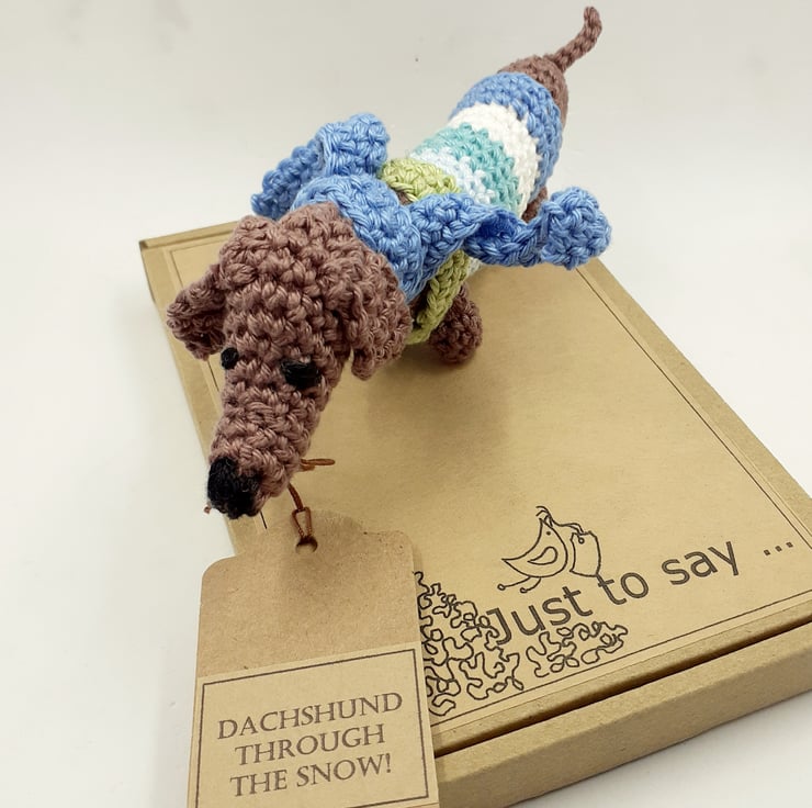 This cheerful little dachshund in a stripy winter jacket and scarf is all rushing through the snow to deliver a message on your behalf. It is crocheted in cotton from a lovely pattern by Amy at amyscrochetcave.com.
