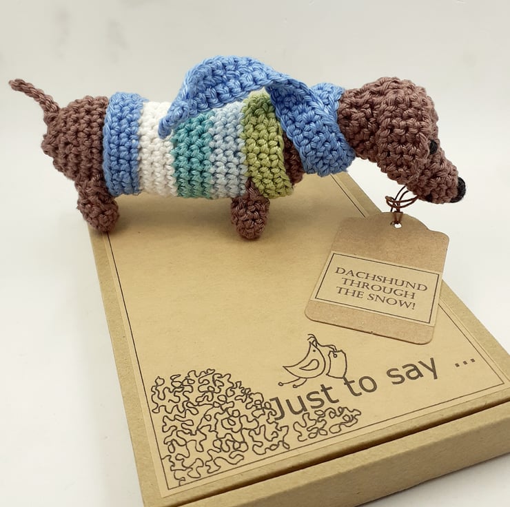 The sausage dog measures approximately 17 cm from nose to tail and comes wrapped in tissue in a labelled PIP (Postage in Proportion) box all ready to be given or posted on.