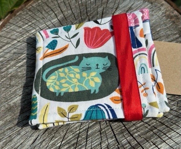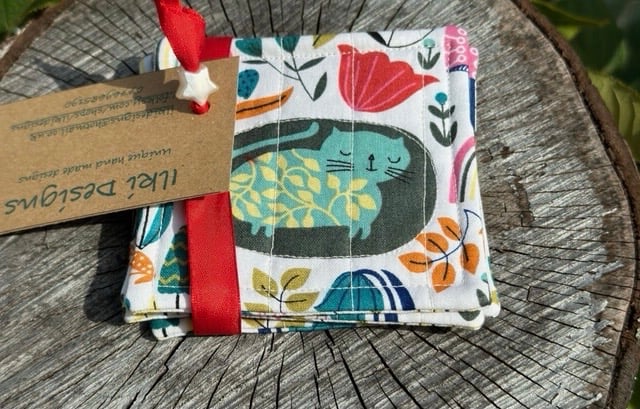 Sets of 4 cat pattern coasters. Size 4.5” (11cm) square. Presented tied with a ribbon so would make a pretty gift. Coasters are made in cotton fabric with a wadding insert