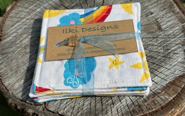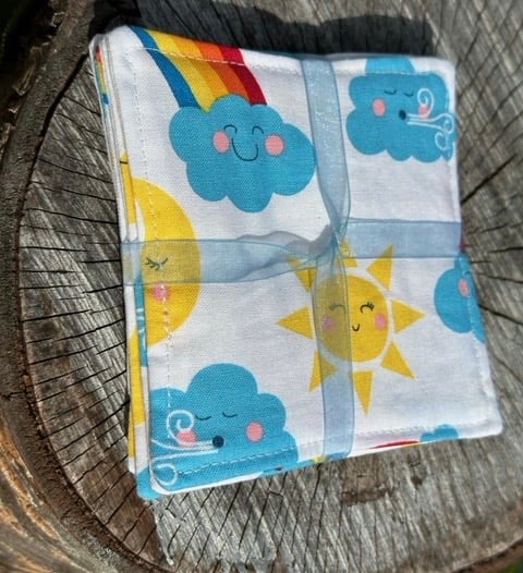 Sets of 4 Rainbow coasters. Size 4.5” (11cm) square. Presented tied with a ribbon so would make a pretty gift. Coasters are made in cotton fabric