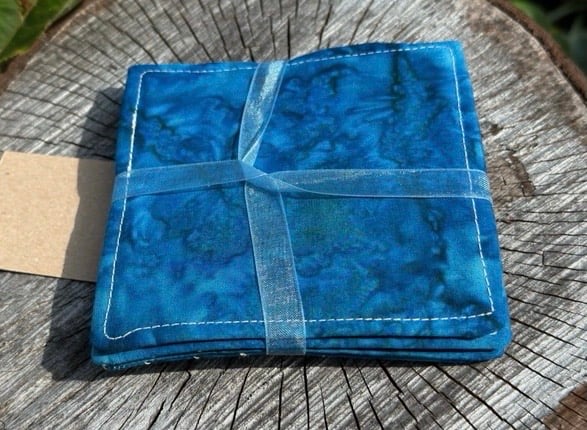 Sets of 4 turquoise coasters. Size 4.5” (11cm) square. Presented tied with a ribbon so would make a pretty gift. Coasters are made in cotton fabric