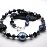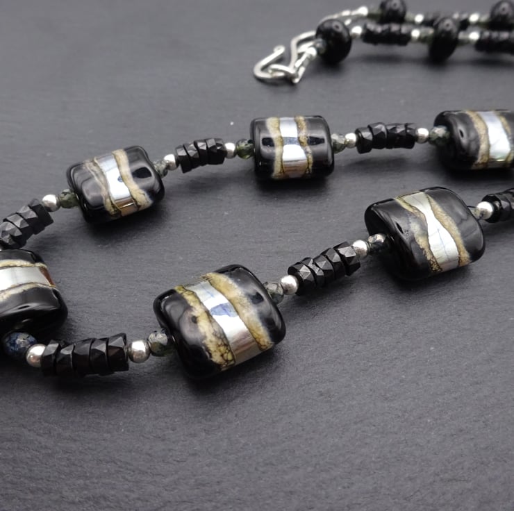 A necklace made using handmade lampwork glass beads, sterling silver beads and Grade AA Black Spinel gemstone beads.