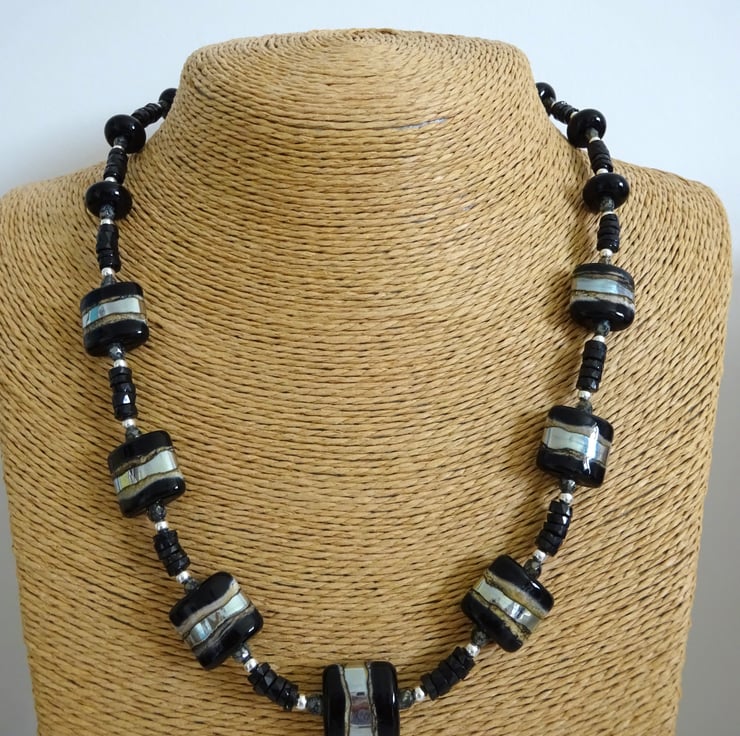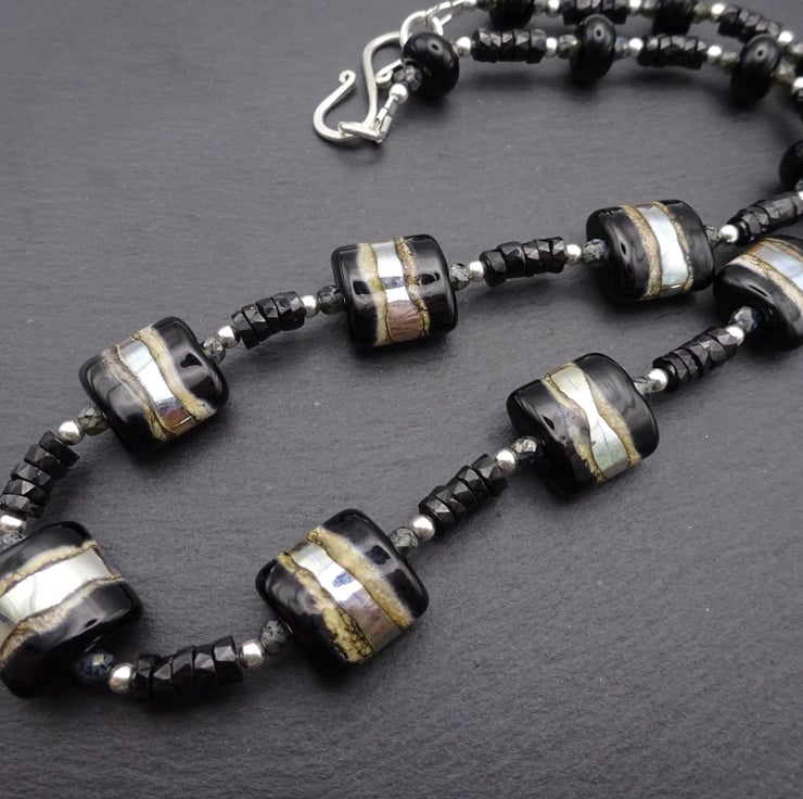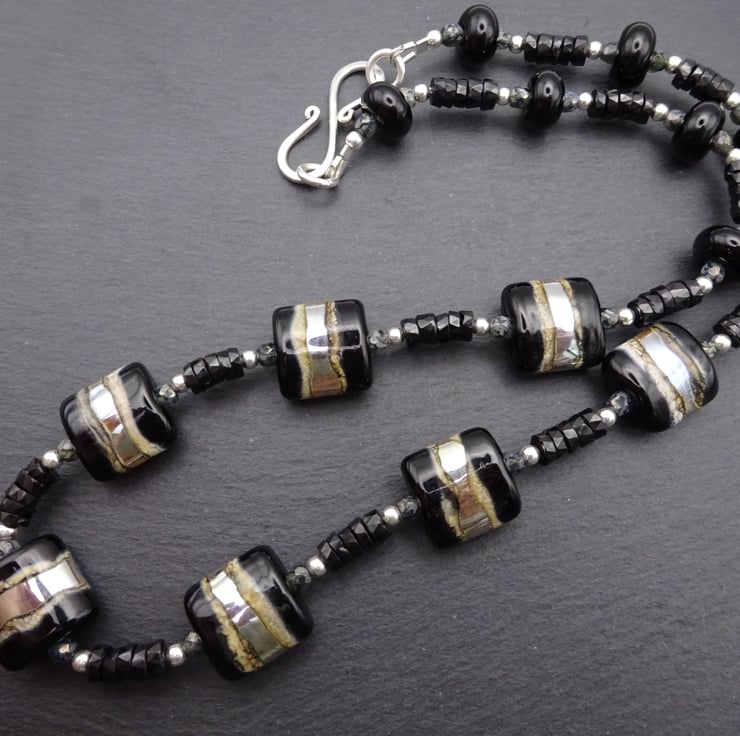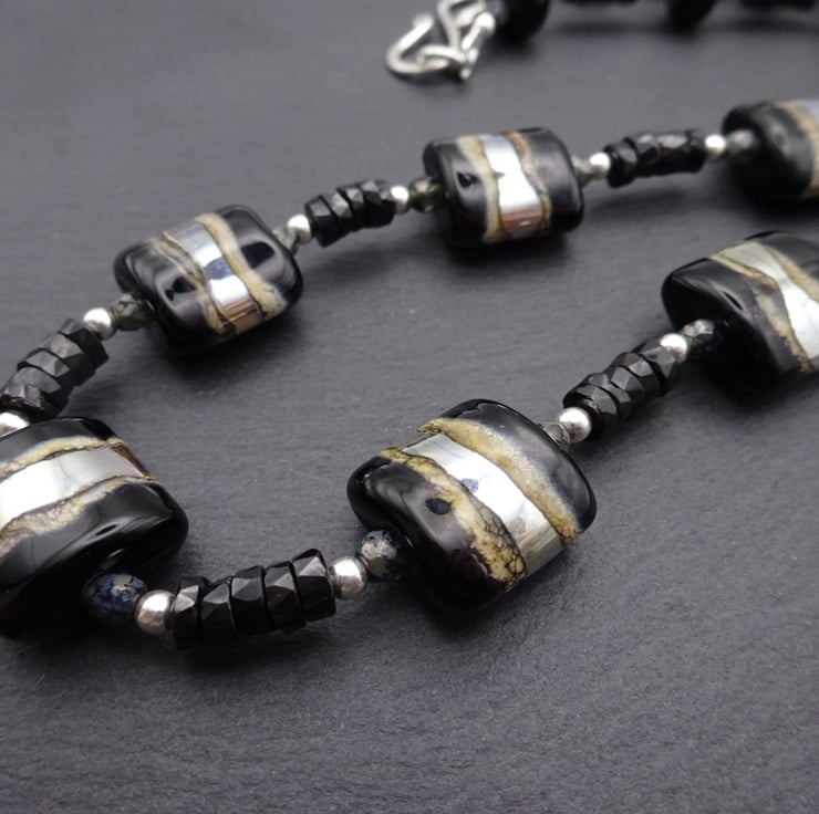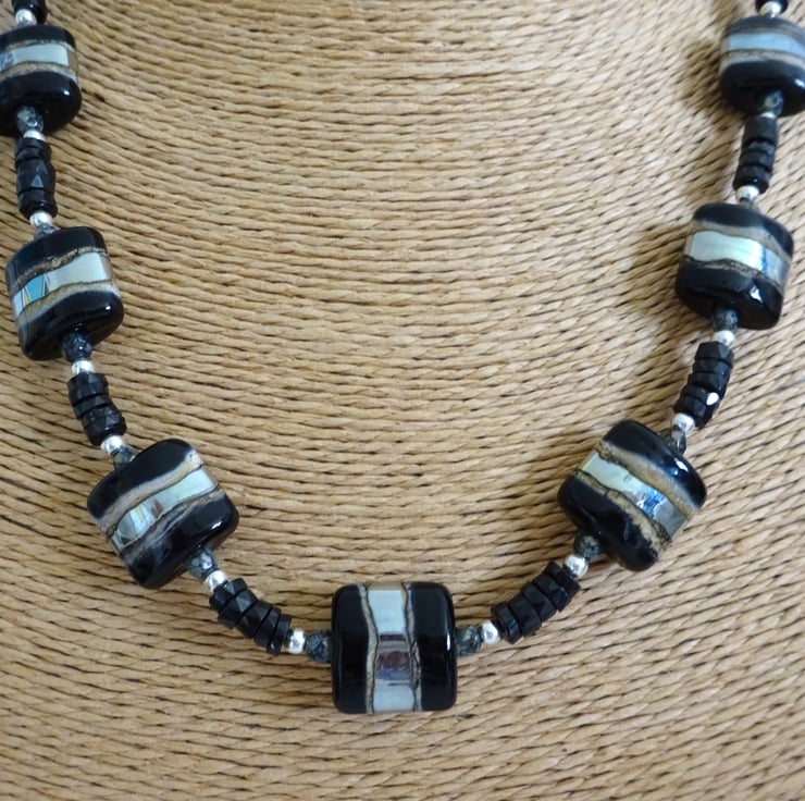 The lampwork beads have been handmade by me using black, ivory and silver glass.