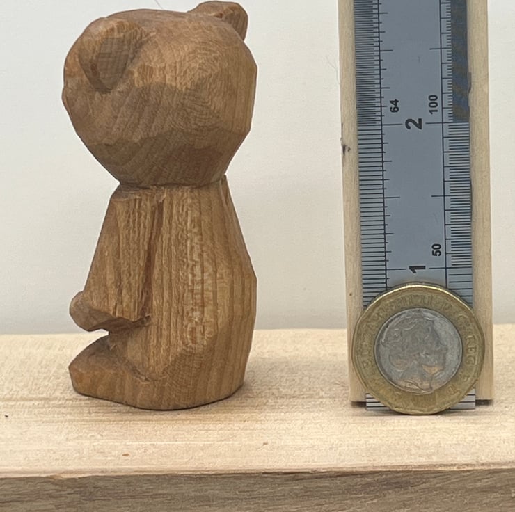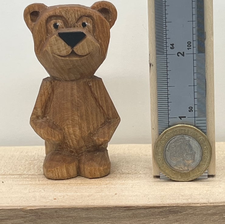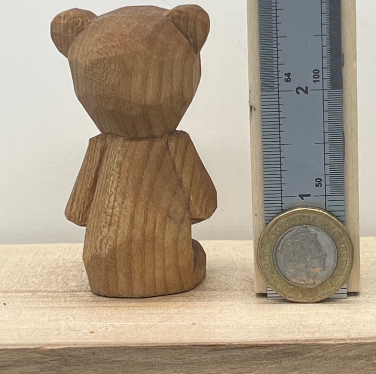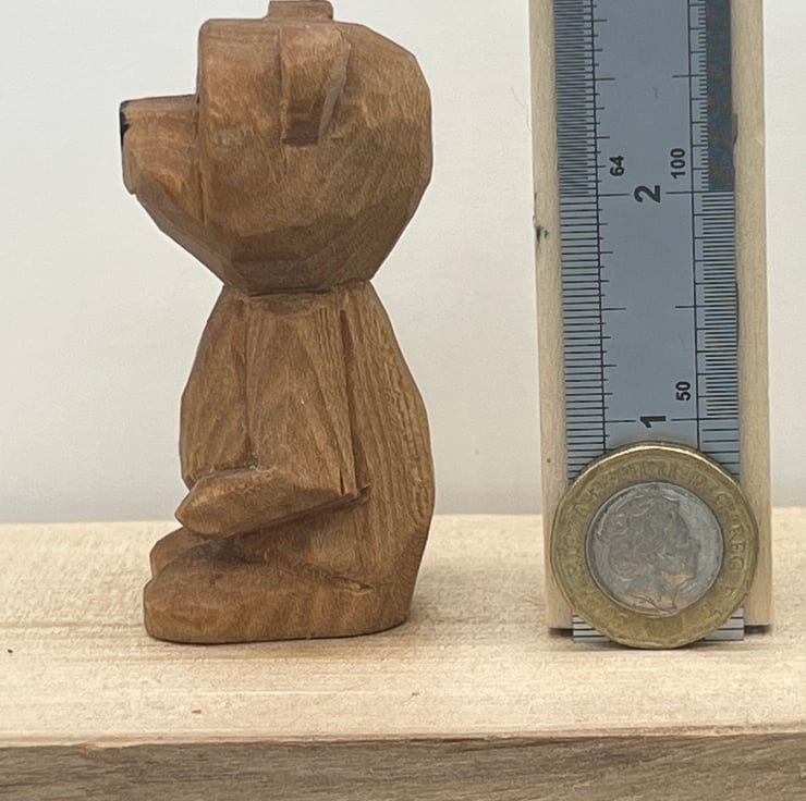 2.75 inches tall (approximately) hand whittled rustic Bear whittled from a single piece of wood & finished with mineral oil.