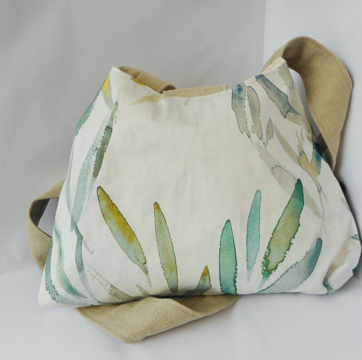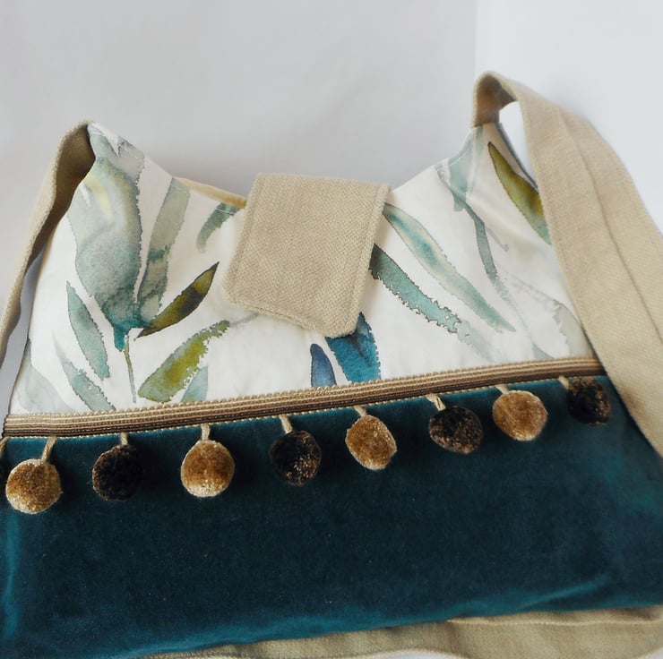 The lower front is a luxurious velvet and the upper front and back are a printed cotton whilst the strap is made from a plain weave in a co-ordinating beige.