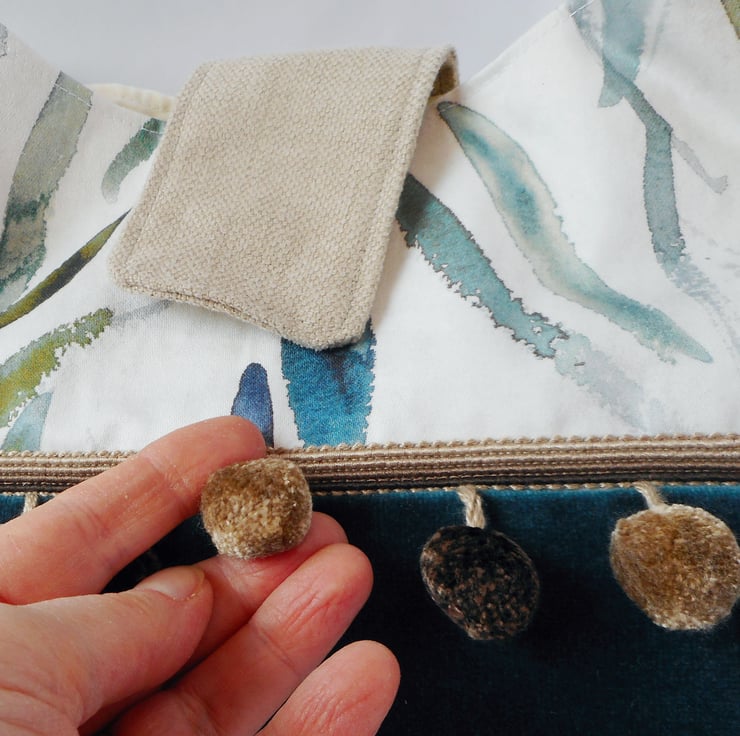 Made from furnishing fabric offcuts, Palma is a pyramid shaped bag in a mix of printed cotton, linen, teal velvet and fun pompom trim.