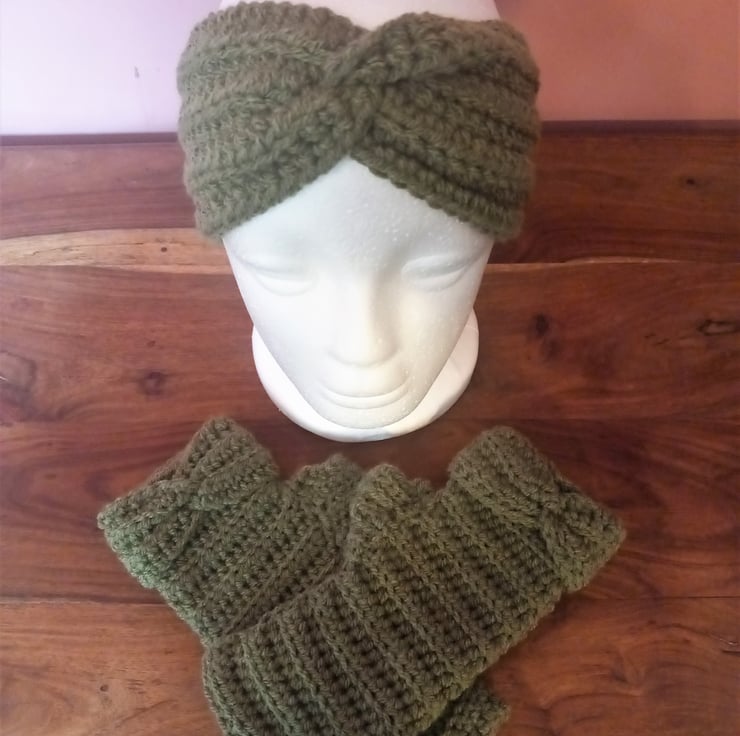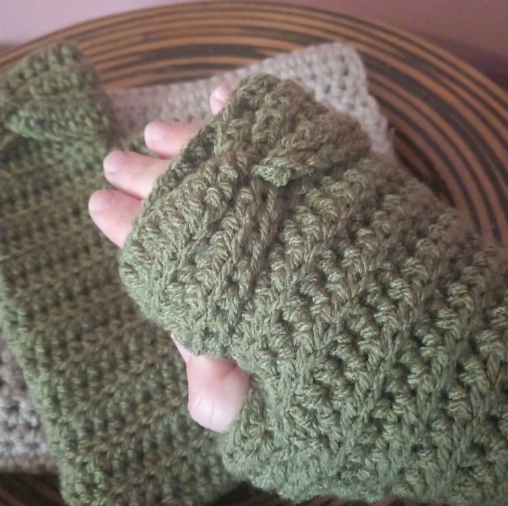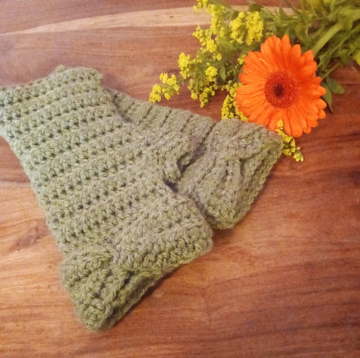 Crafted with care, these fingerless gloves are crocheted from a lush moss green aran weight yarn, ensuring that your hands stay comfortably warm while you enjoy outdoor activities. The light ribbed crochet stitch adds a touch of stretch for a snug, comfortable fit, while a fashionable twisted band at the top of the glove adds a stylish flair. These gloves, measuring approximately 20cm in length, are perfect for both fashion and function.