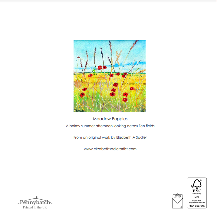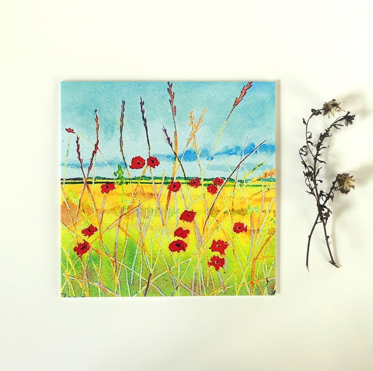 150 x 150 mm square blank fine art greeting card printed on FSC semi-gloss paper produced from an image taken from my original watercolour painting of poppies in a field under a blue sky