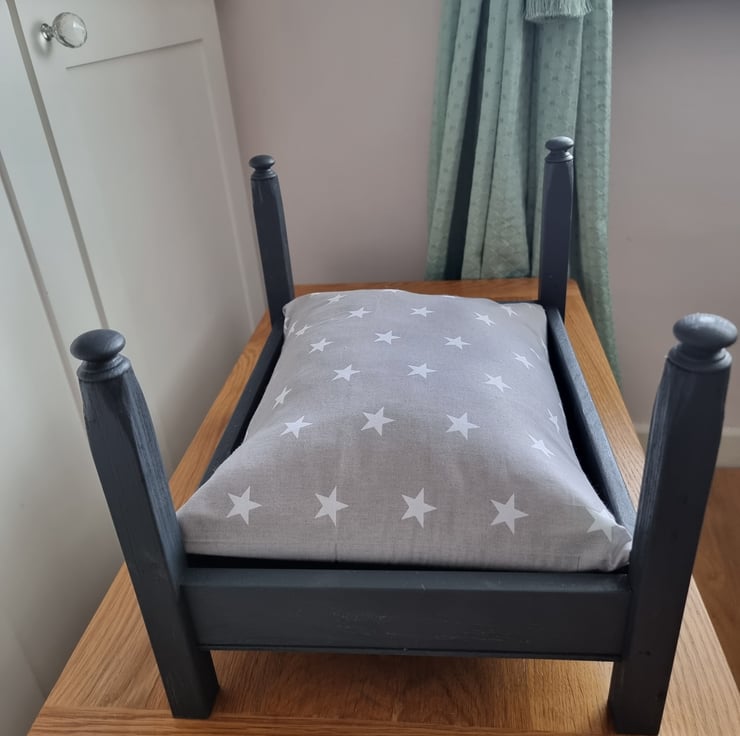 Grey 4 poster cat/dog bed handmade with a soft padded grey with stars mattress for the comfort of your pet.