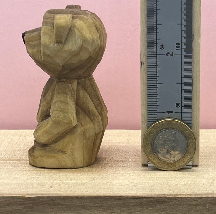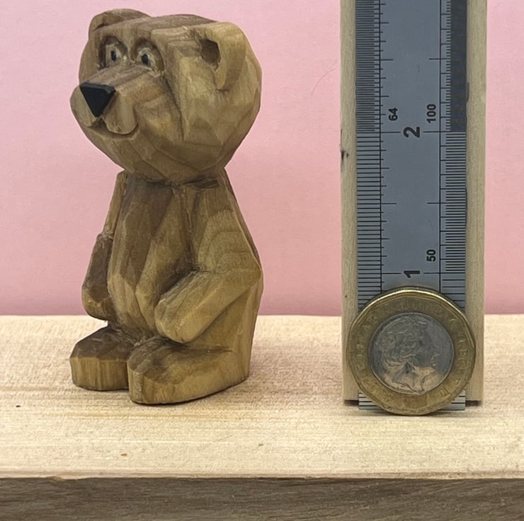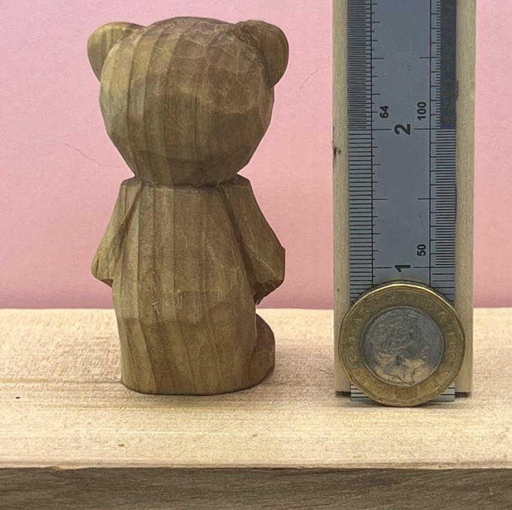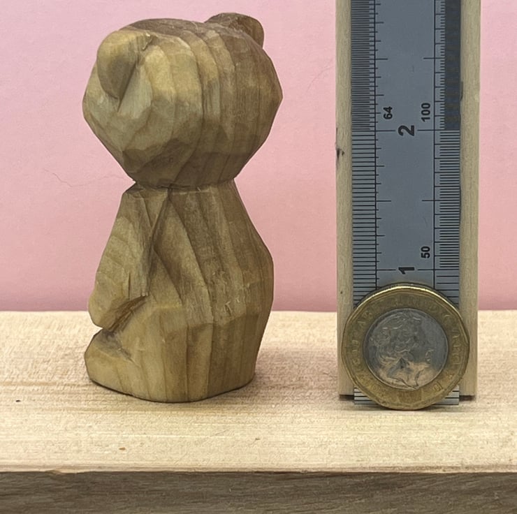 2.75 inches tall (approximately) hand whittled rustic Bear whittled from a single piece of wood & finished with mineral oil.