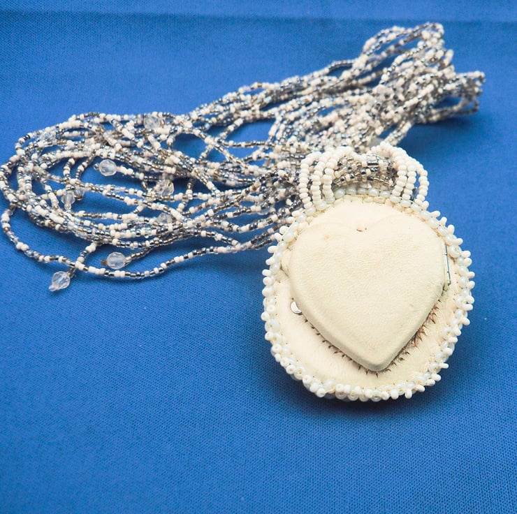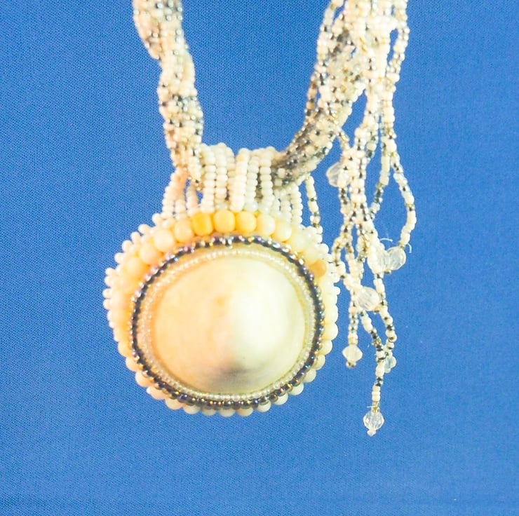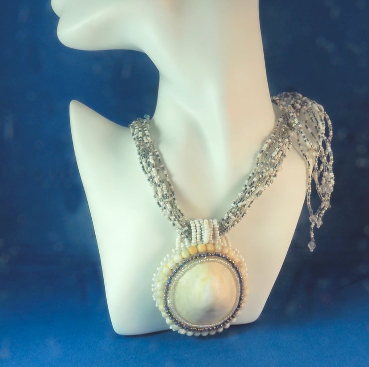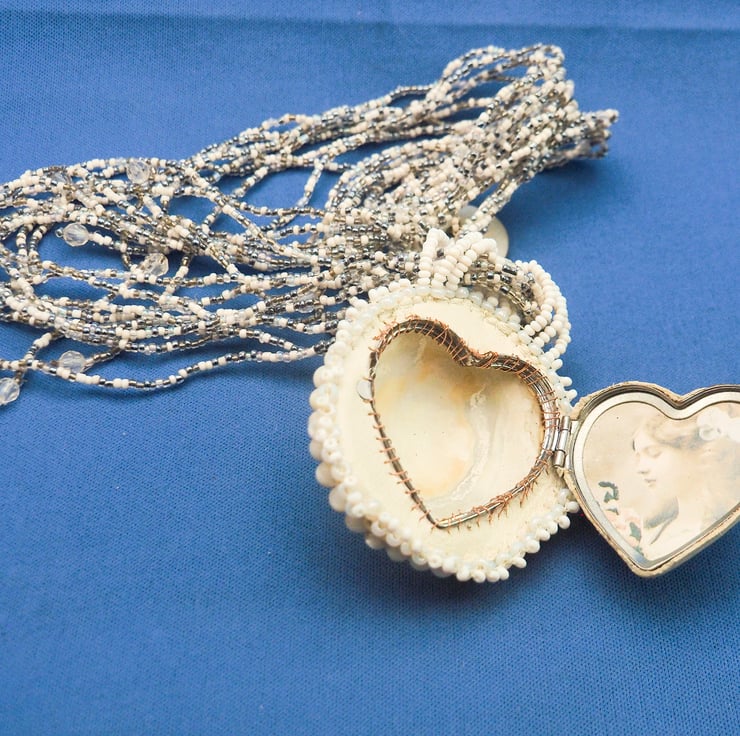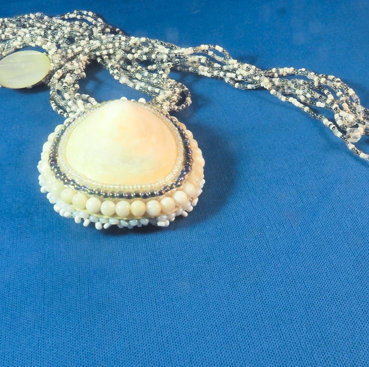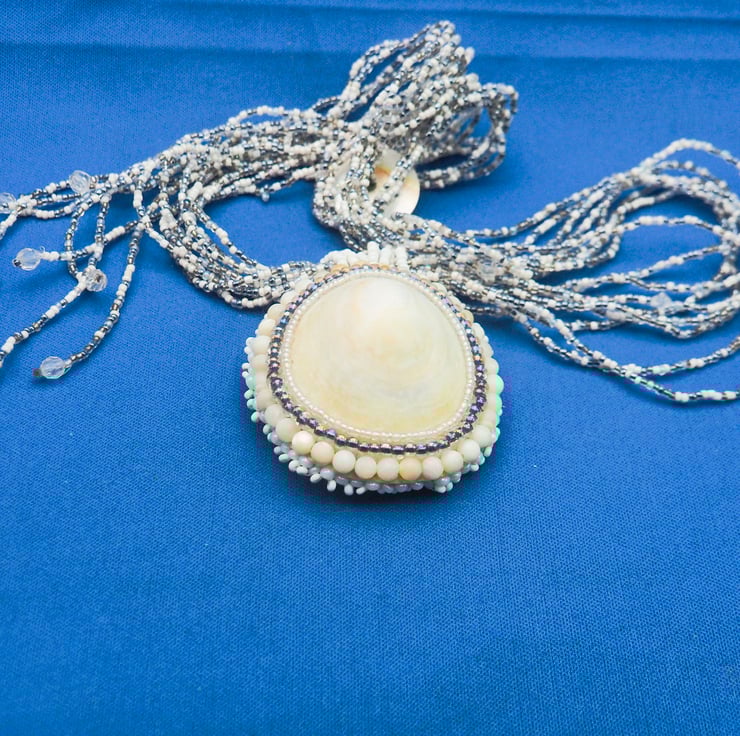 A really big limpet shell made into a pendant with a locket opening at the back. The pendant is mostly in shades of white and cream with a little silver and subtle rainbow colours. The shell has been polished to a pearly finish and there are faint shades of blue and pink in it.The pendant is created by stitching rows of beads around the shell to fix it to a backing fabric. A layer of thin copper is added before the fine, white leather backing, to support the locket, which is made by cutting the back off a little, heart shaped tin I found. This is stitched to the piece with fine copper wire. A layer of the white leather is glued to the lid of the tin,
