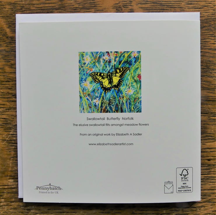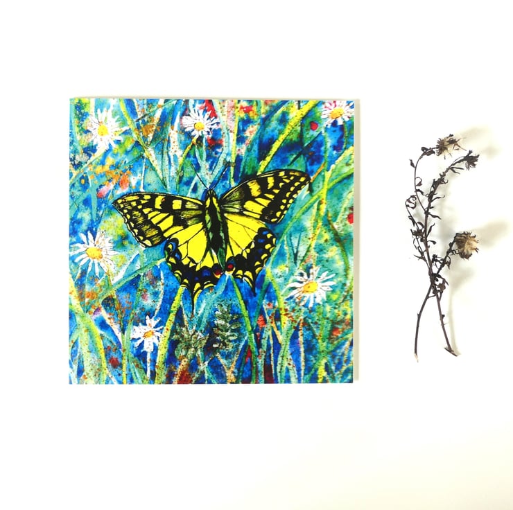 150 x 150 mm square blank fine art greeting card printed on FSC semi-gloss paper produced from an image taken from my own original l watercolour painting of a swallowtail butterfly amongst summer meadow wildflowers