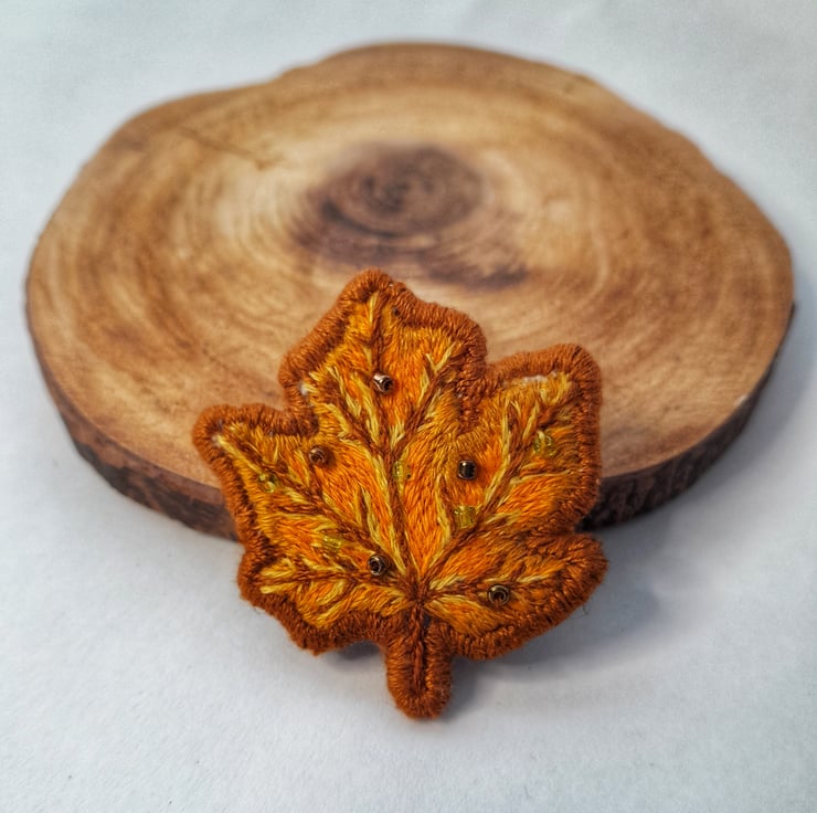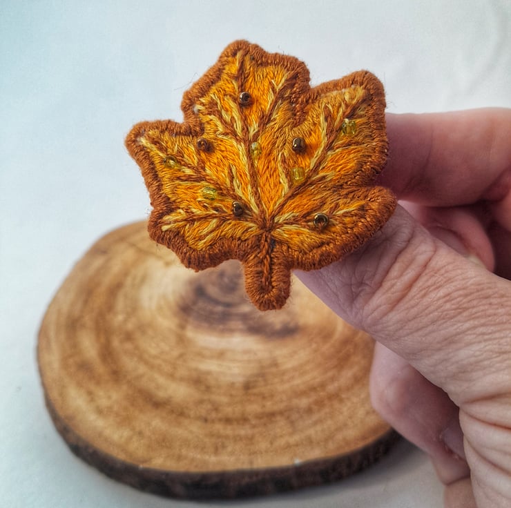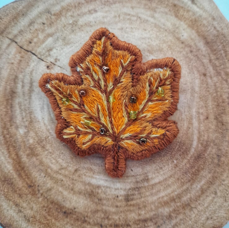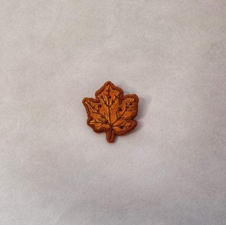 This Autumn brooch leaf has been delicately embroidered with DMC mouline embroidery thread and with tiny seed beads