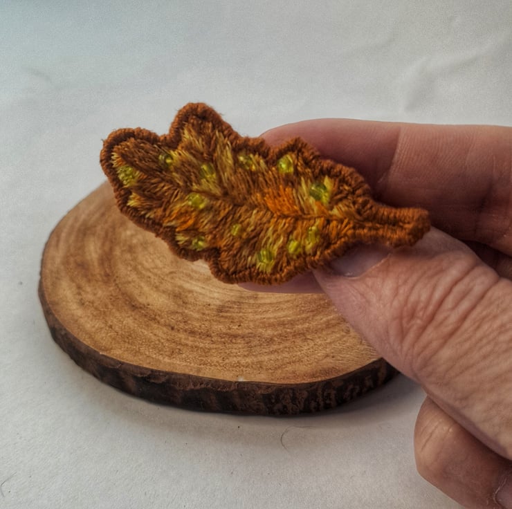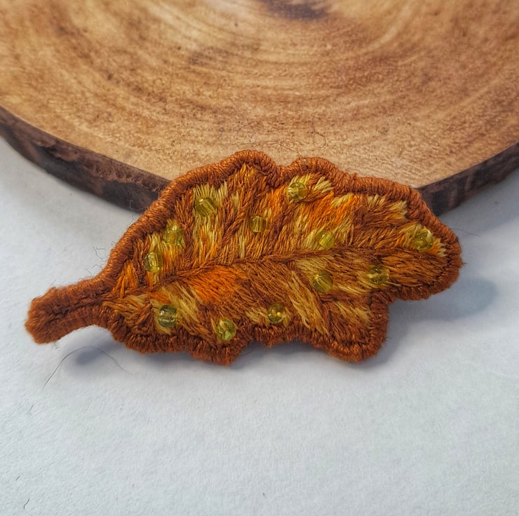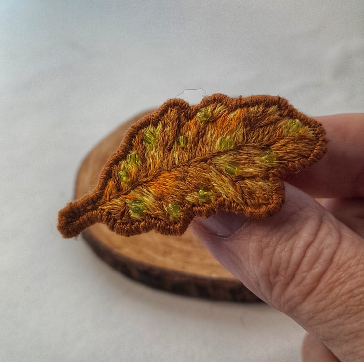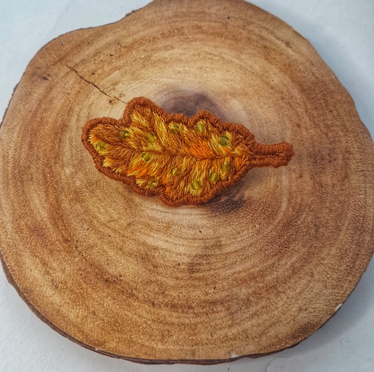 This little autumn coloured leaf brooch was hand embroidered with DMC embroidery thread and scattered tiny yellow seed beads