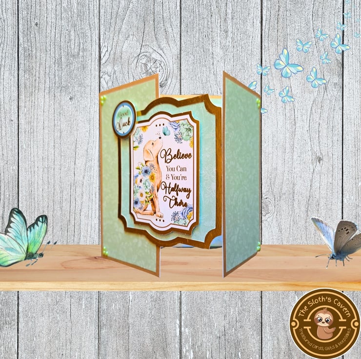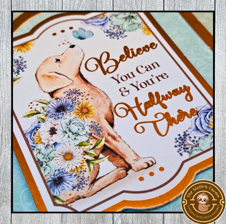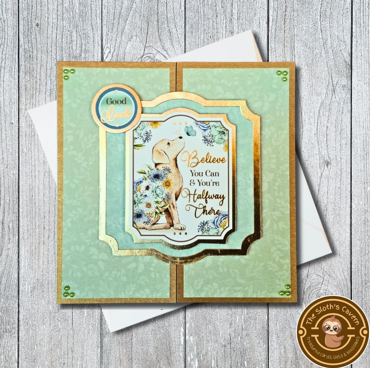 The card consists of gold pearlescent card layered with floral patterned luxury paper, displaying the image of a Labrador puppy in blooming flowers! It is decorated with gold foiled toppers with the sentiment "Good Luck", & the motivational message "Believe You Can & You're Halfway There". Matching craft pearls decorate all four corners of the card. The little butterfly has been embellished with glitter colour drops.