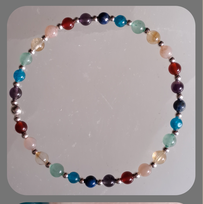 Elasticated Chakra bracelet made with 7 different coloured gemstones stones and sterling silver beads.