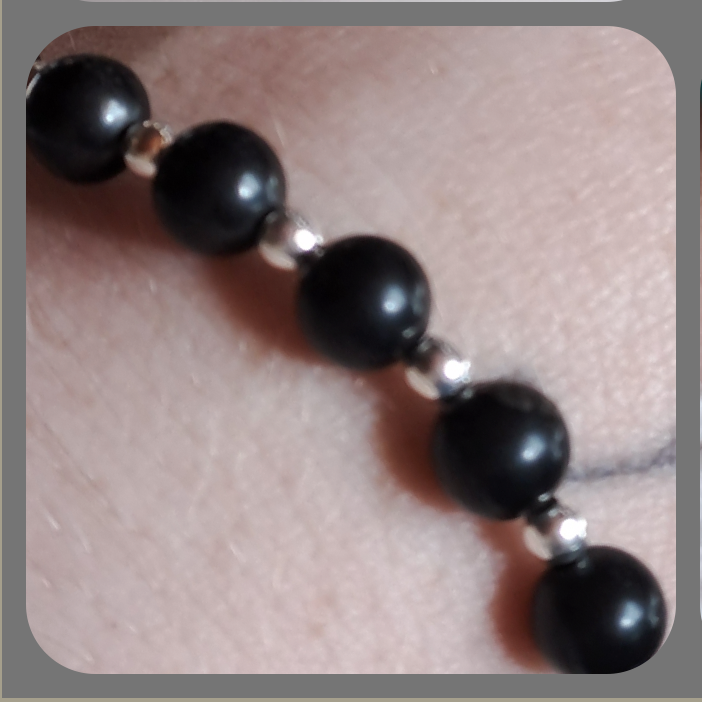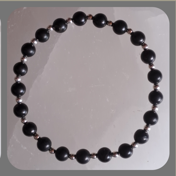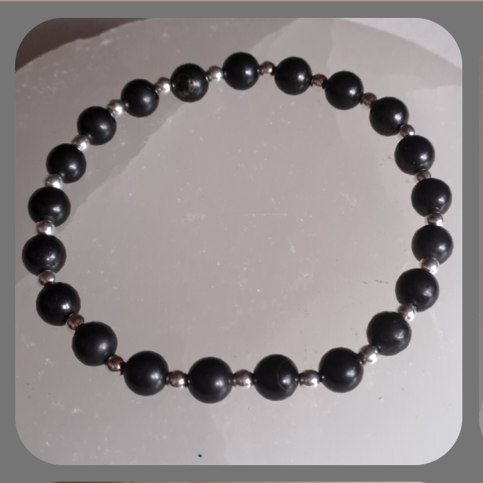 The Shungite beads are approximately 6mm, and the sterling silver are 3mm, and the bracelet measures about 6.75 inches. As it's elasticated it is better to role on instead of stretching.