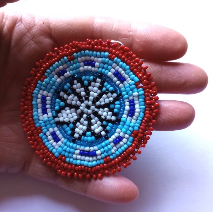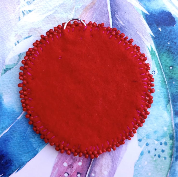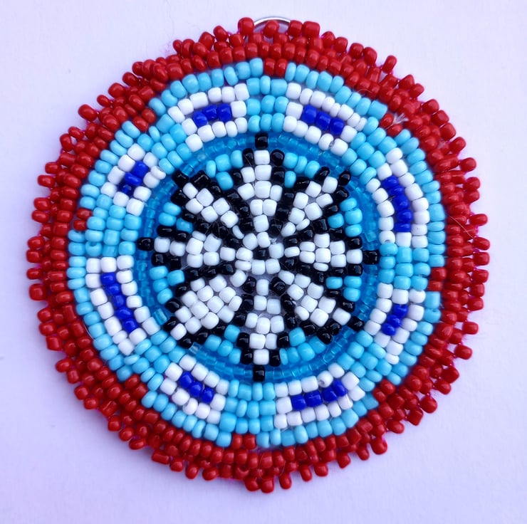 The item measures 7cm in diameter. It has an original design made using blue, black and white glass seed beads and edged in red picot style beading. The backing is matching red felt. There is a secure jump ring added on the back for suspension on your own cord or chain.