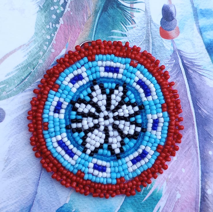The item is inspired by my love of Native American beadwork, which includes beautiful beaded medallions full of symbology, that are used on traditional and Pow Wow Regalia and other sacred items.