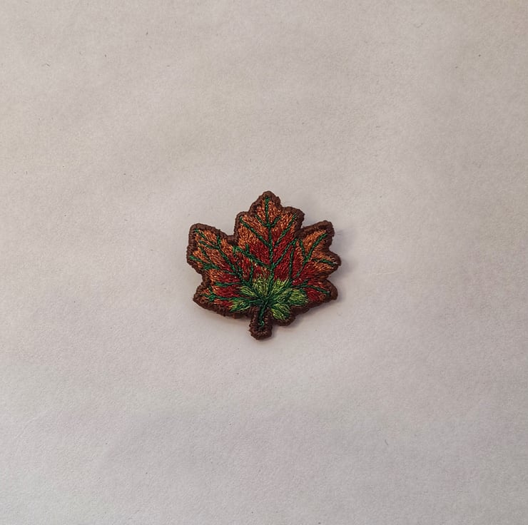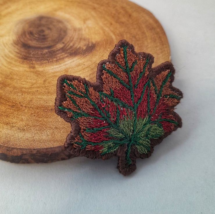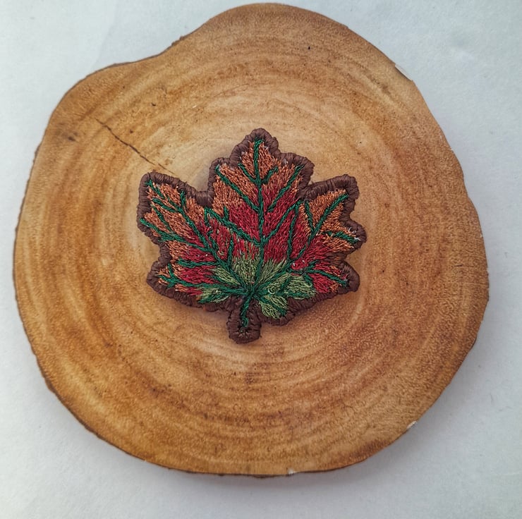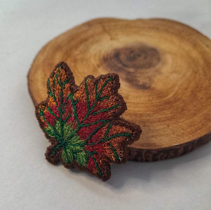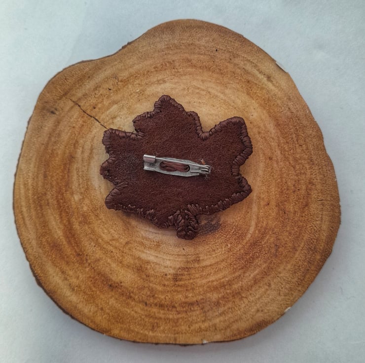 This lovely shimmering Autumn Leaf brooch was hand embroidered using DMC metallic light effect embroidery thread.