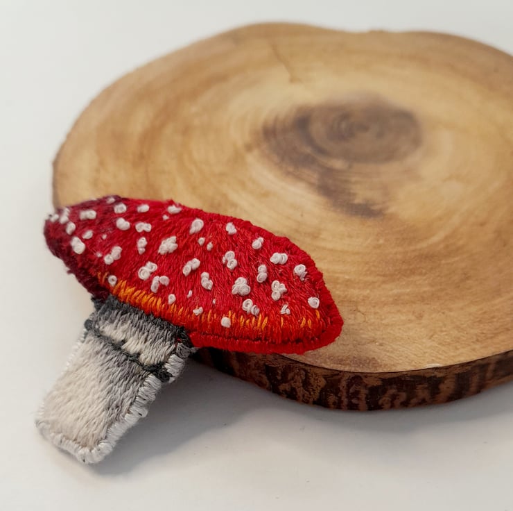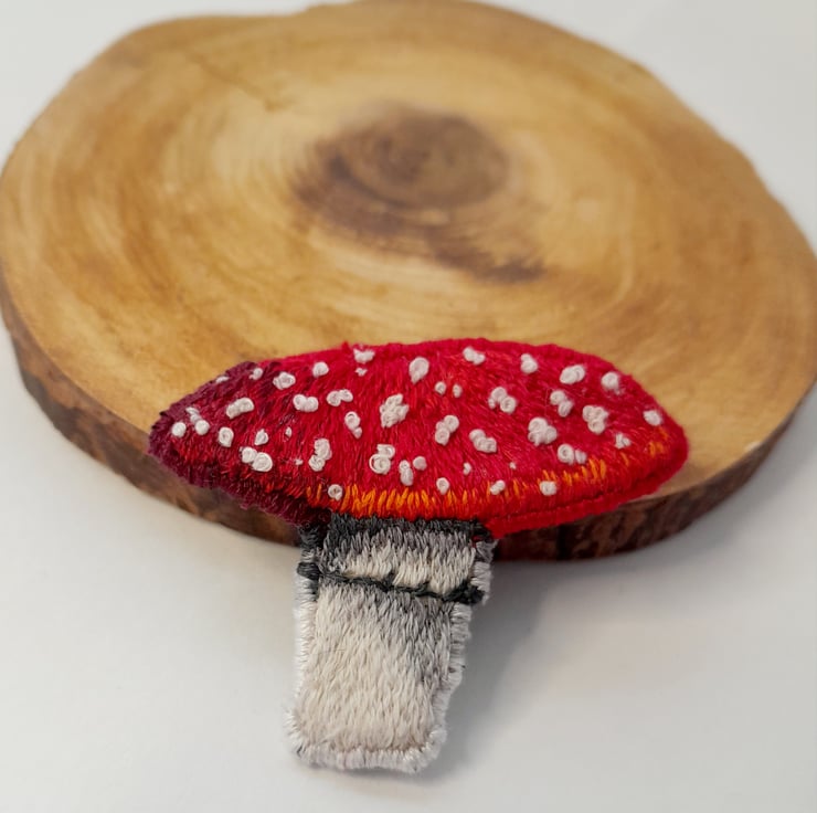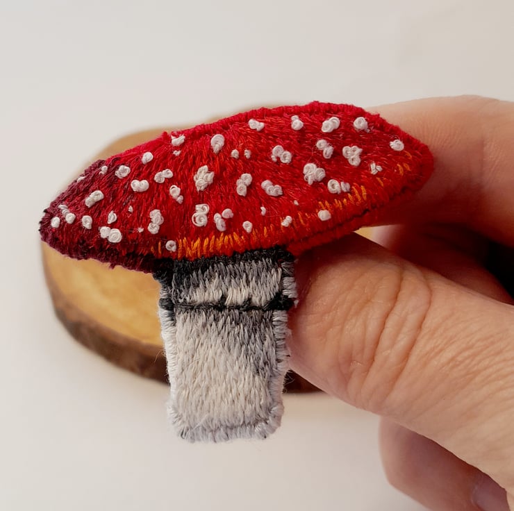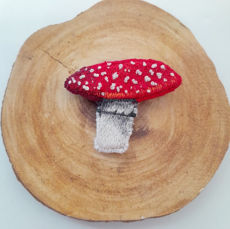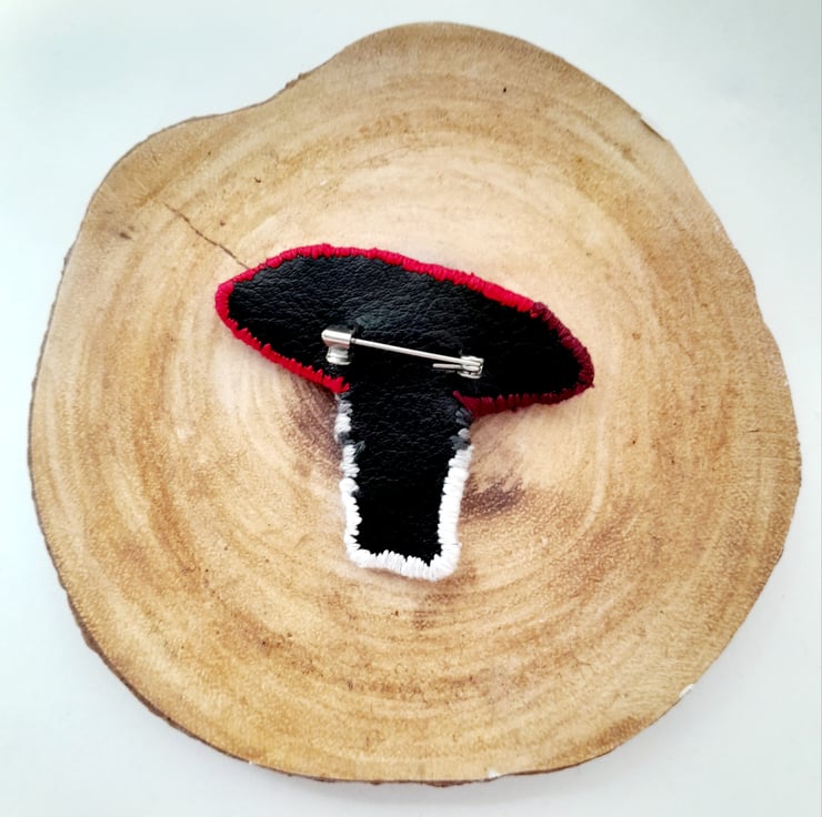 This lovely realistic mushroom Brooch has been hand embroidered with DMC mouline thread and backed with black faux leather with a stainless steel clasp.