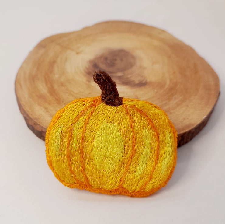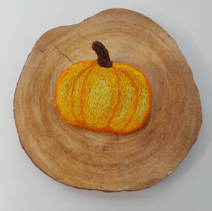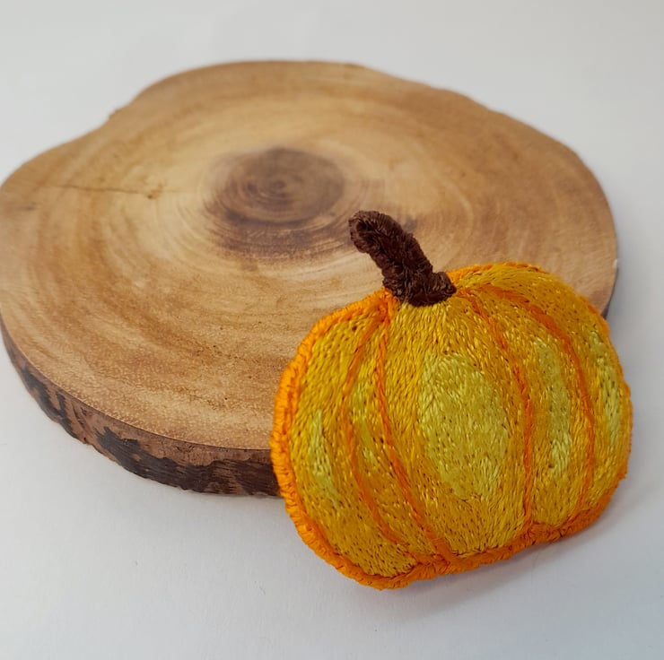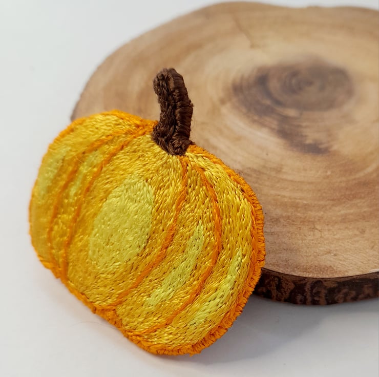 This brightly coloured Pumpkin Brooch/keyring was made with DMC Satin thread which gives off a lovely subtle sheen.