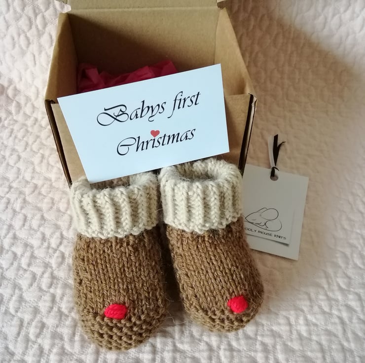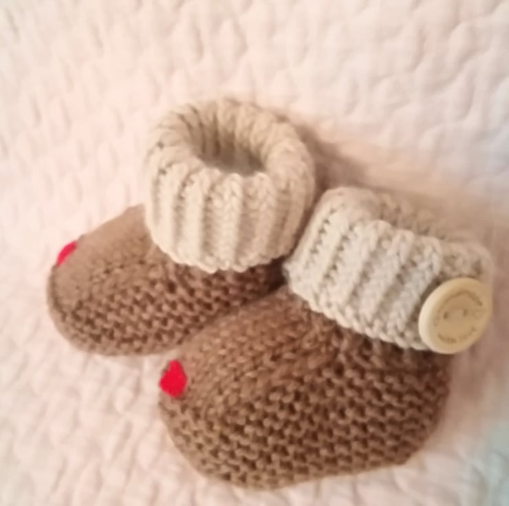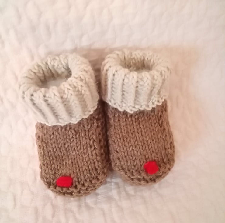 Hand knitted baby reindeer booties . These have cream fold over ankle cuff and brown bootie , red nose is added also has wooden button attached that says handmade with love. . Knitted in 65% alpaca 35% merino. Hand wash only