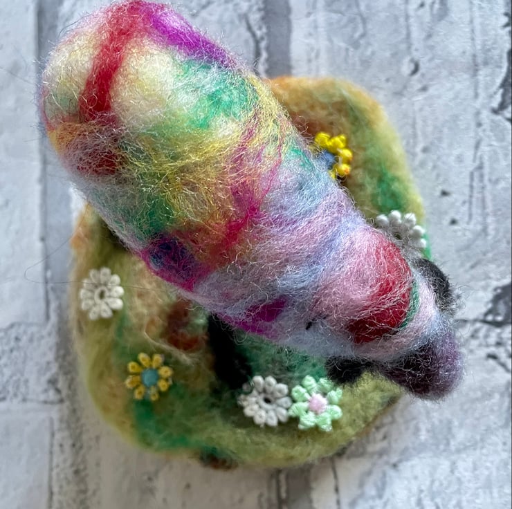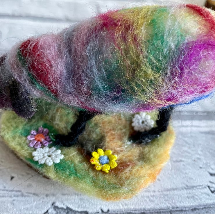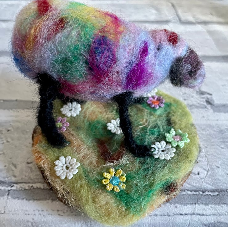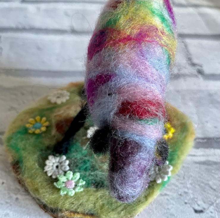This colourful amazing rainbow inspired Sheep has been needle felted by hand, with cotton embroidered flowers adorning the base. A perfect gift for a fabulous friend, who brightens your day as much as this will brighten theirs! Or for that bright sheep in your family who sparkles, glows and brightens your day.