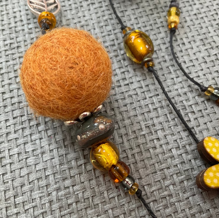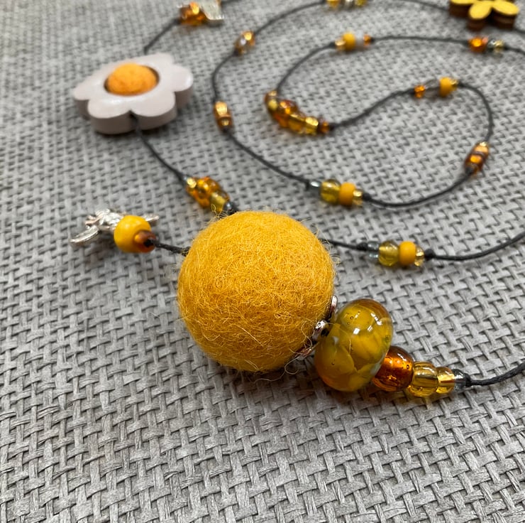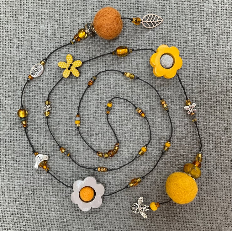 Lariat necklace featuring a glorious mixture of beads in shades of yellow, with an hint of pale grey. The beads include painted wood flowers, felt balls, glass, glass foil and wooden beads, as well as antique silver tone bird, butterfly and flower beads. This necklace also features two unique glass beads handmade by glass artist Nadege de la Garde, The necklace is finished at the ends with antique silver tone leaf and bee charms and is strung on strong, flexible waxed linen thread.