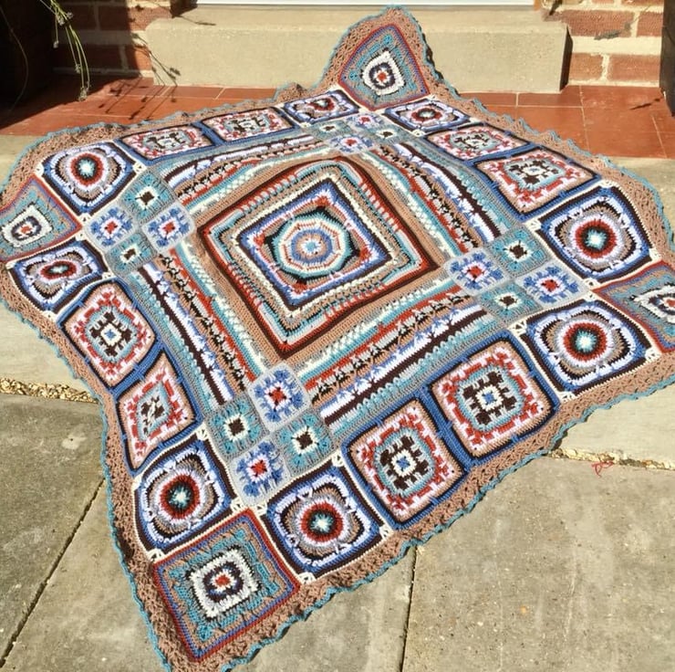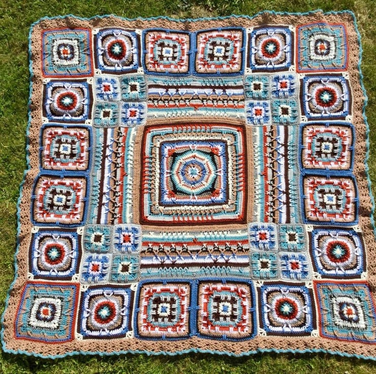 This hand crocheted blanket has been made using Stylecraft Special double knit yarn. It is a beautifully soft washable acrylic yarn. The design is The Ross Poldark Blanket by Catherine Bligh and I have made it using the original colour palette. It is many squares and rectangles joined to create a stunning pattern. It is a square and approximately 1.4 metres each side. This blanket will become an heirloom piece that will look good displayed in a lounge or bedroom and keep you warm as the colder weather arrives.