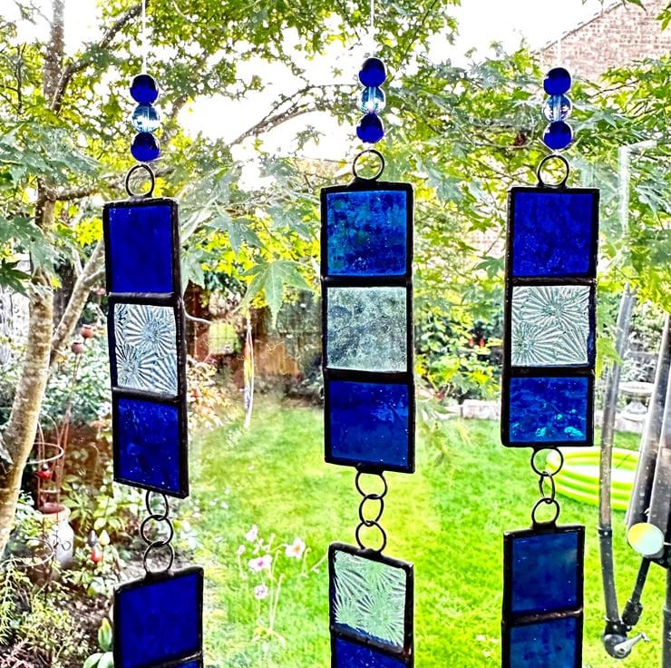 Each piece of glass has been cut by hand, ground, washed and foiled then soldered together, then washed again. I have applied a patina to blacken the solder. The glass pieces have had rings soldered to attached together and a length of beaded line and hook attached for hanging purposes.