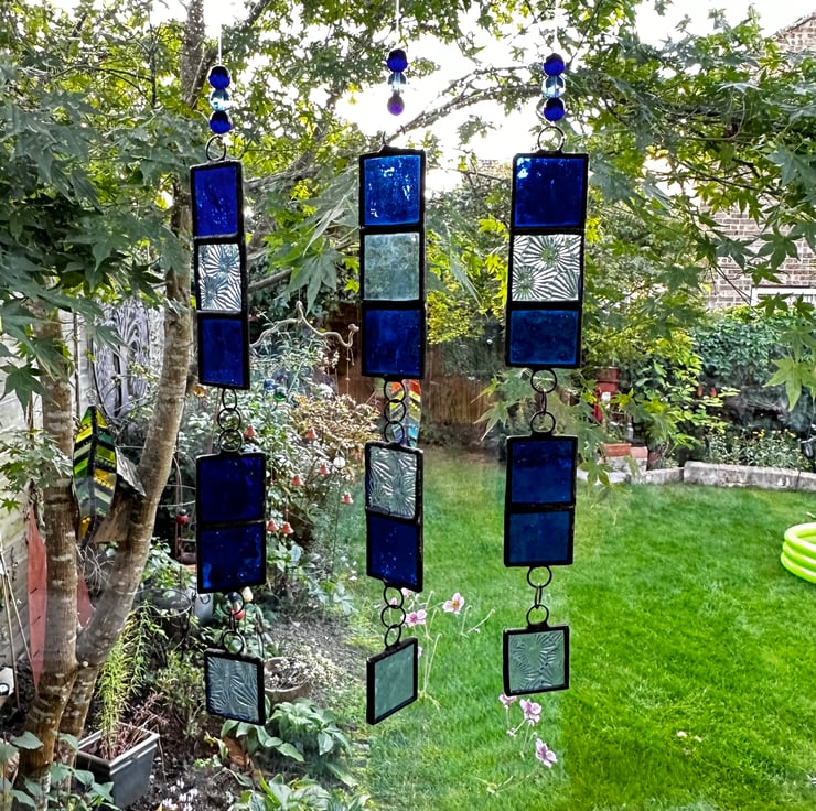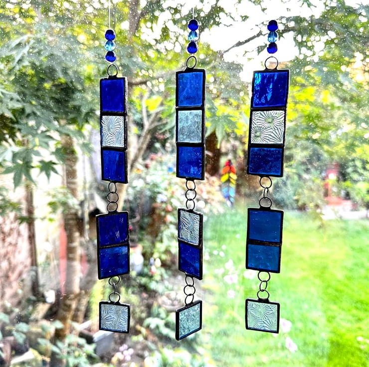 These window hangers have been made using different types of blue stained glass which compliment each other.