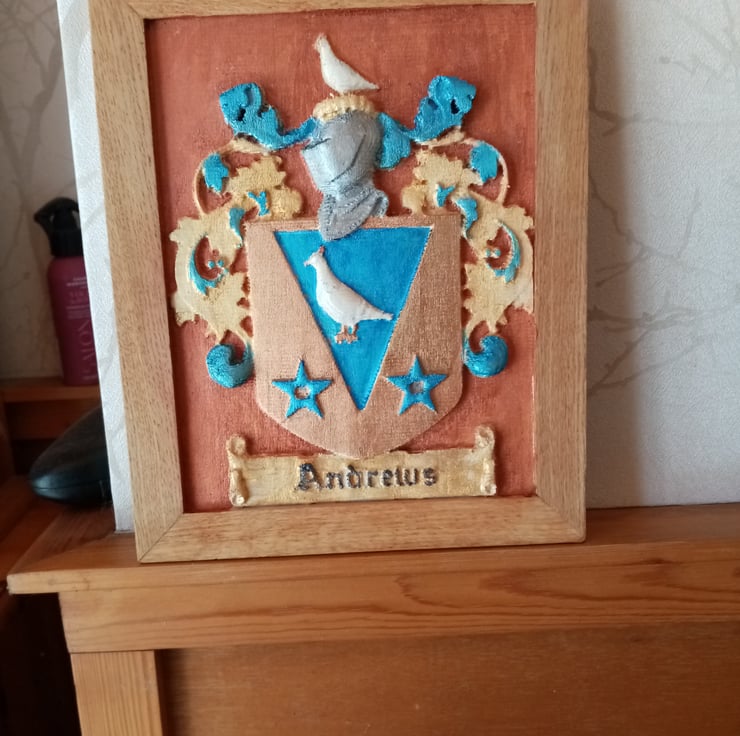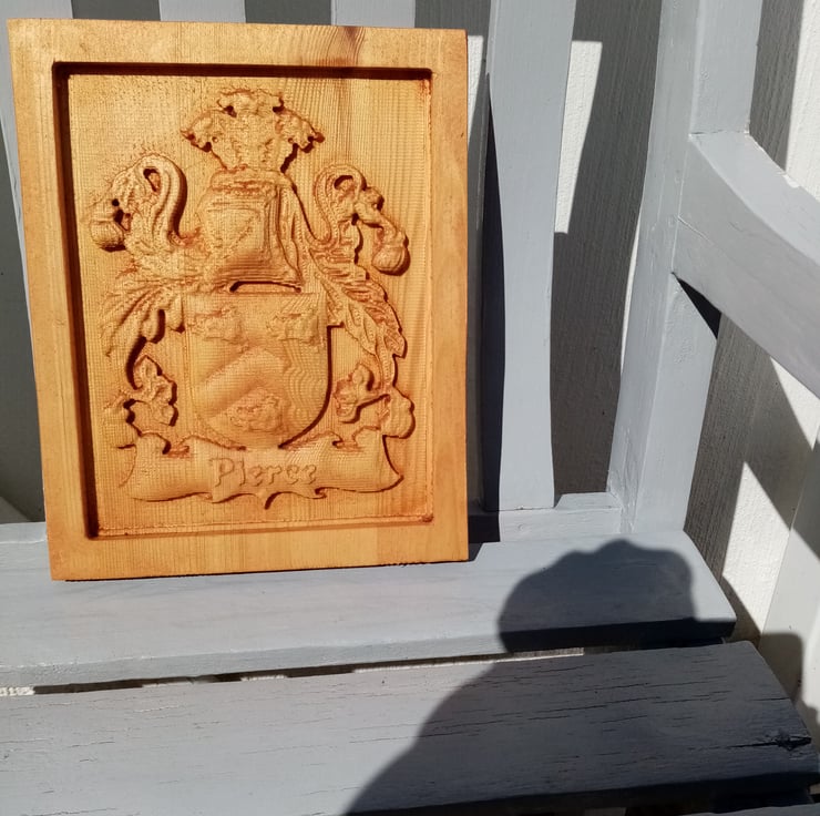 Your own unique family crest carved in a 3 dimensional relief on solid hardwood. Dimensions 250mm x 200mm x 18mm Let me have your surname and I will check to see if your family crest is available with no obligation to purchase.