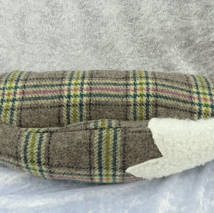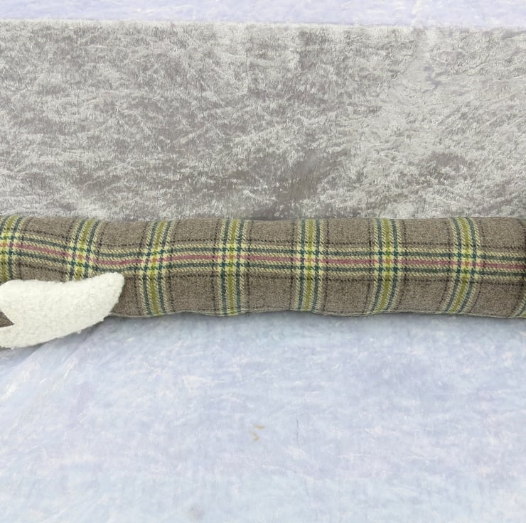 This body of this draught excluder is made from 100% wool, with a tartan design.