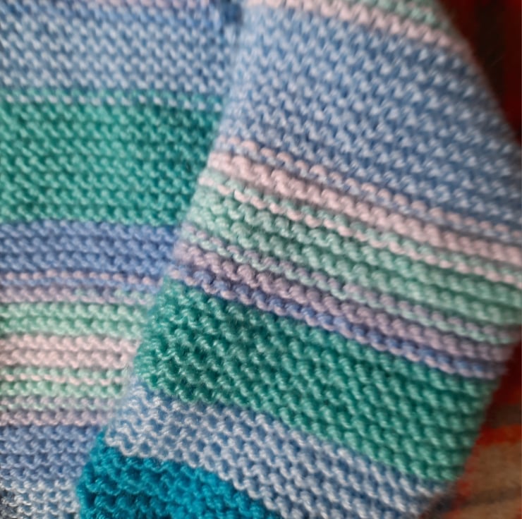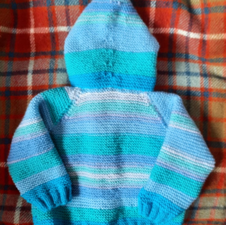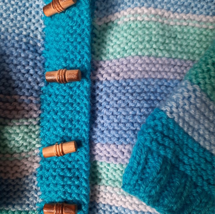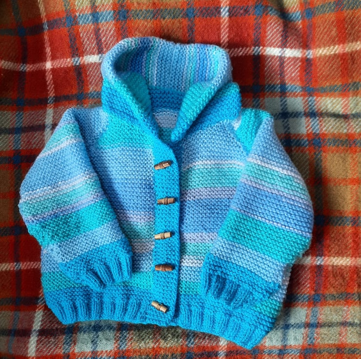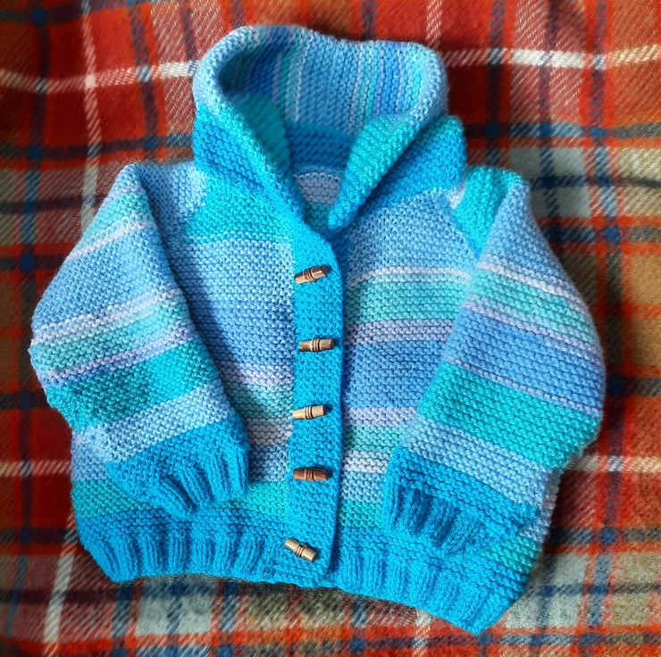 Hand knitted in beautiful shades of blue this gorgeous little hoody fastens with 5 wooden toggles and has a snugly warm hood to keep the chilly winds at bay. To fit chest 22 to 24 inches back length 11 inches and sleeve length 8 inches to fit appropriately 12 to 18 months. The yarn is vegan friendly 100% acrylic and can be washed at 30 degrees for easy care.