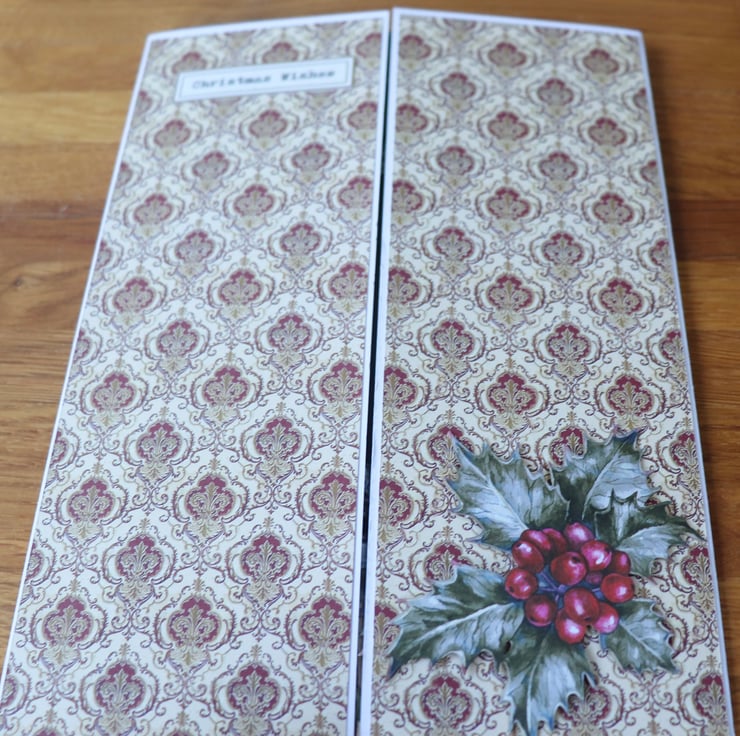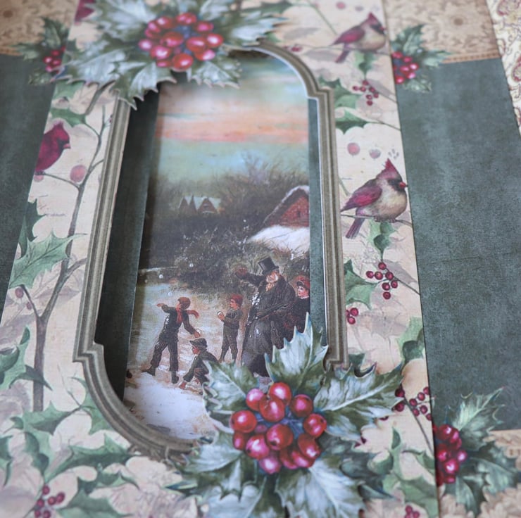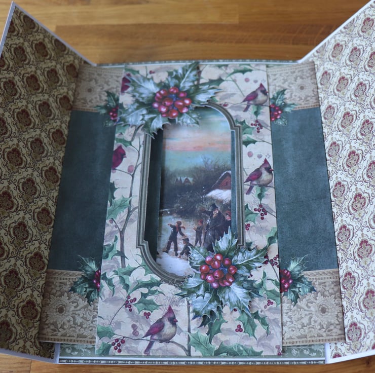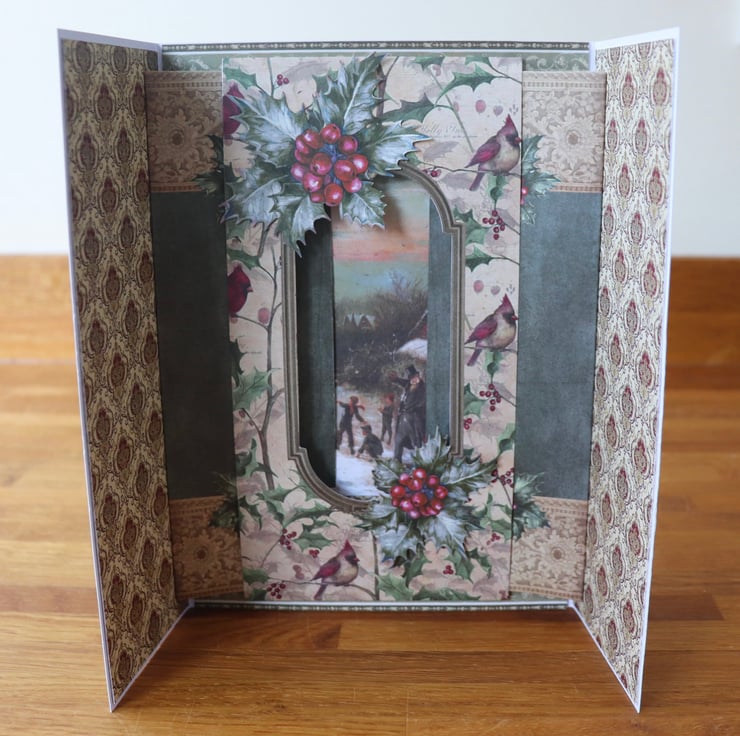 This card is full of christmas colours and lush colourful holly and when the card is opened the sliders move back to reveal a beautiful vintage christmas scene.