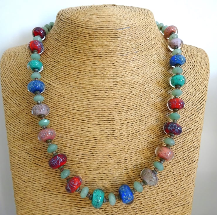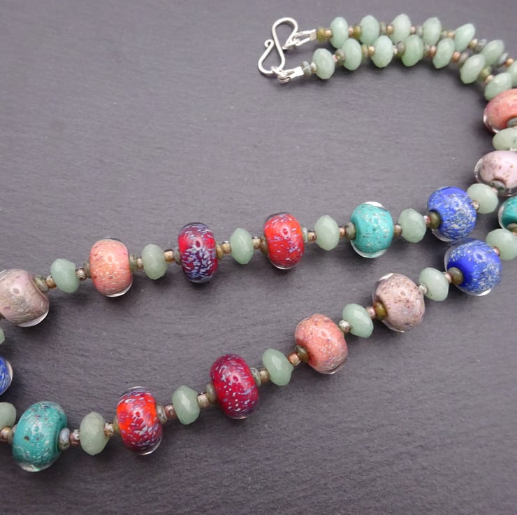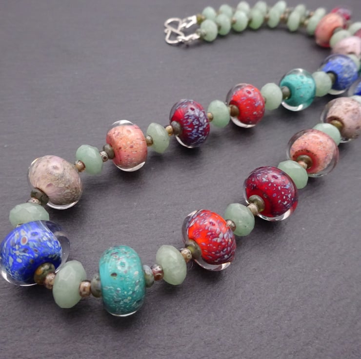 A necklace made with handmade lampwork glass beads, Czech glass beads and aventurine gemstone beads.