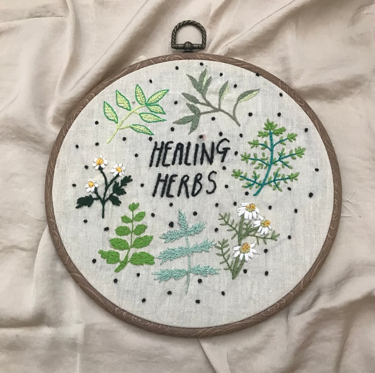 I wanted to experiment with different embroidery stitches to create various plants at the time of design I had just started growing a herb garden on my kitchen windowsill which gave me the inspiration to use herbs as an inspiration.